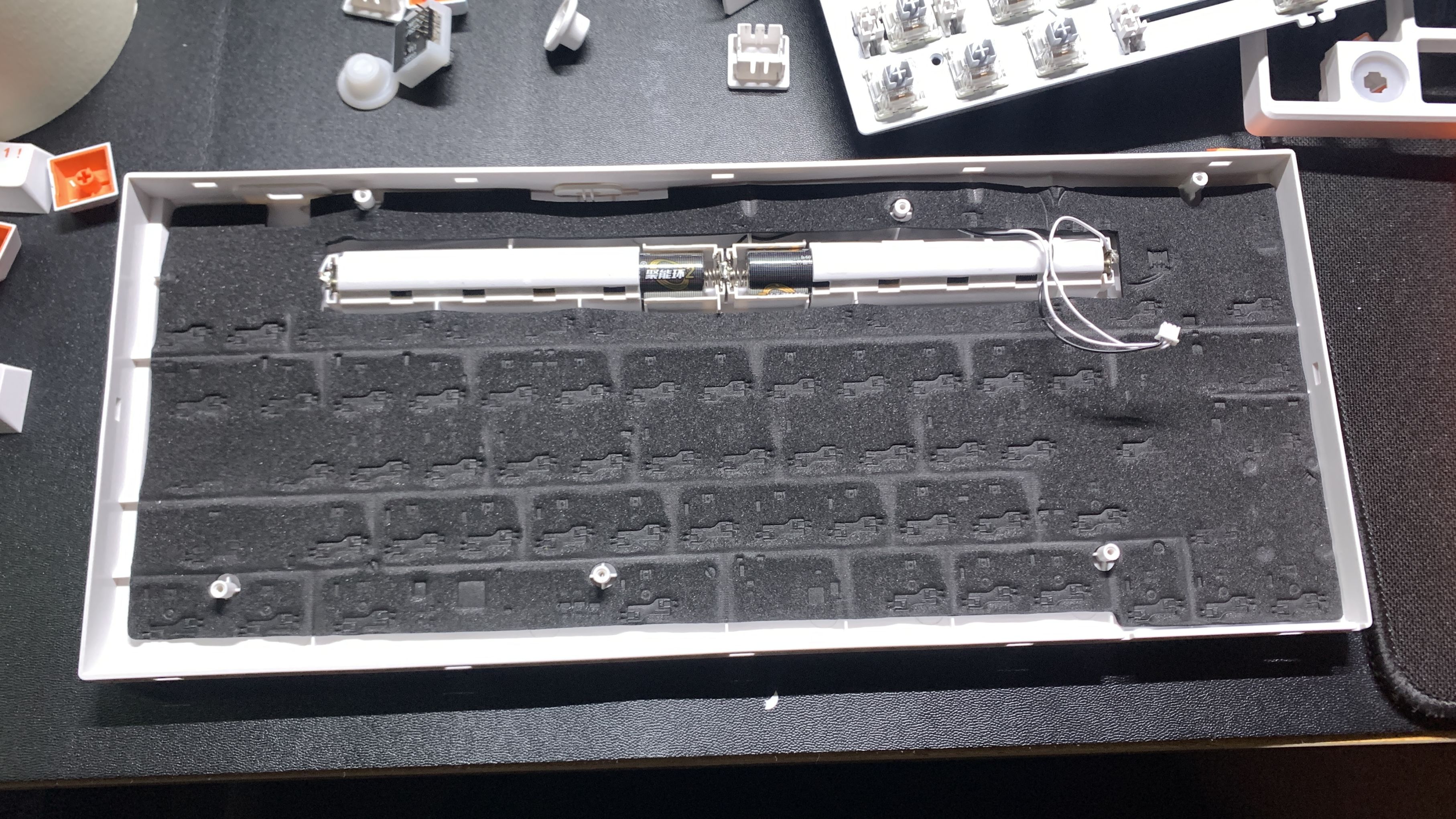 底棉也做了相对应的开槽设计,这里是很不错的啊,从这个棉上的痕迹也能看见这把键盘的底部空间其实很小,使得整体的高度也不算高,可以做到不用手托使用也很方便。