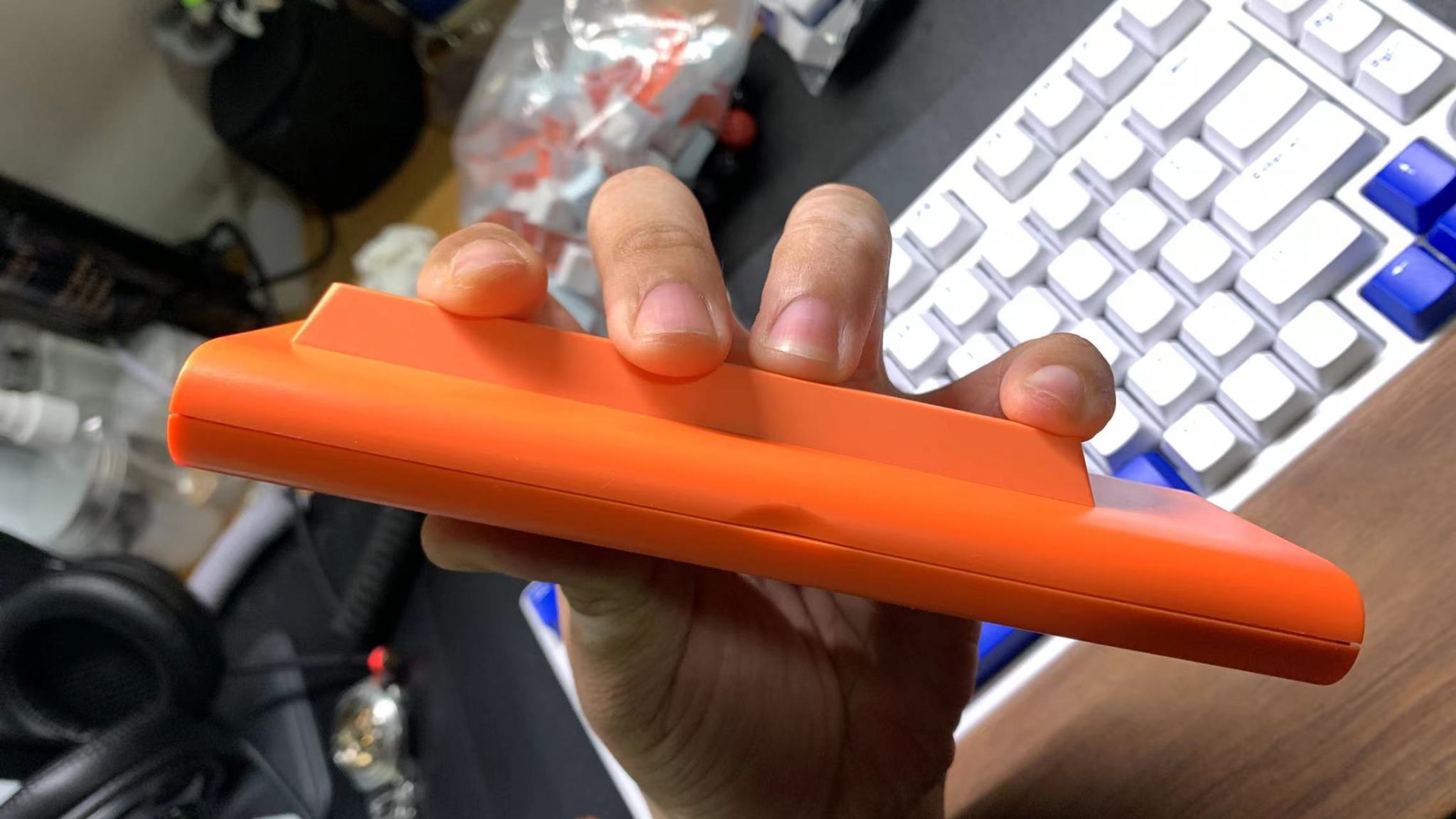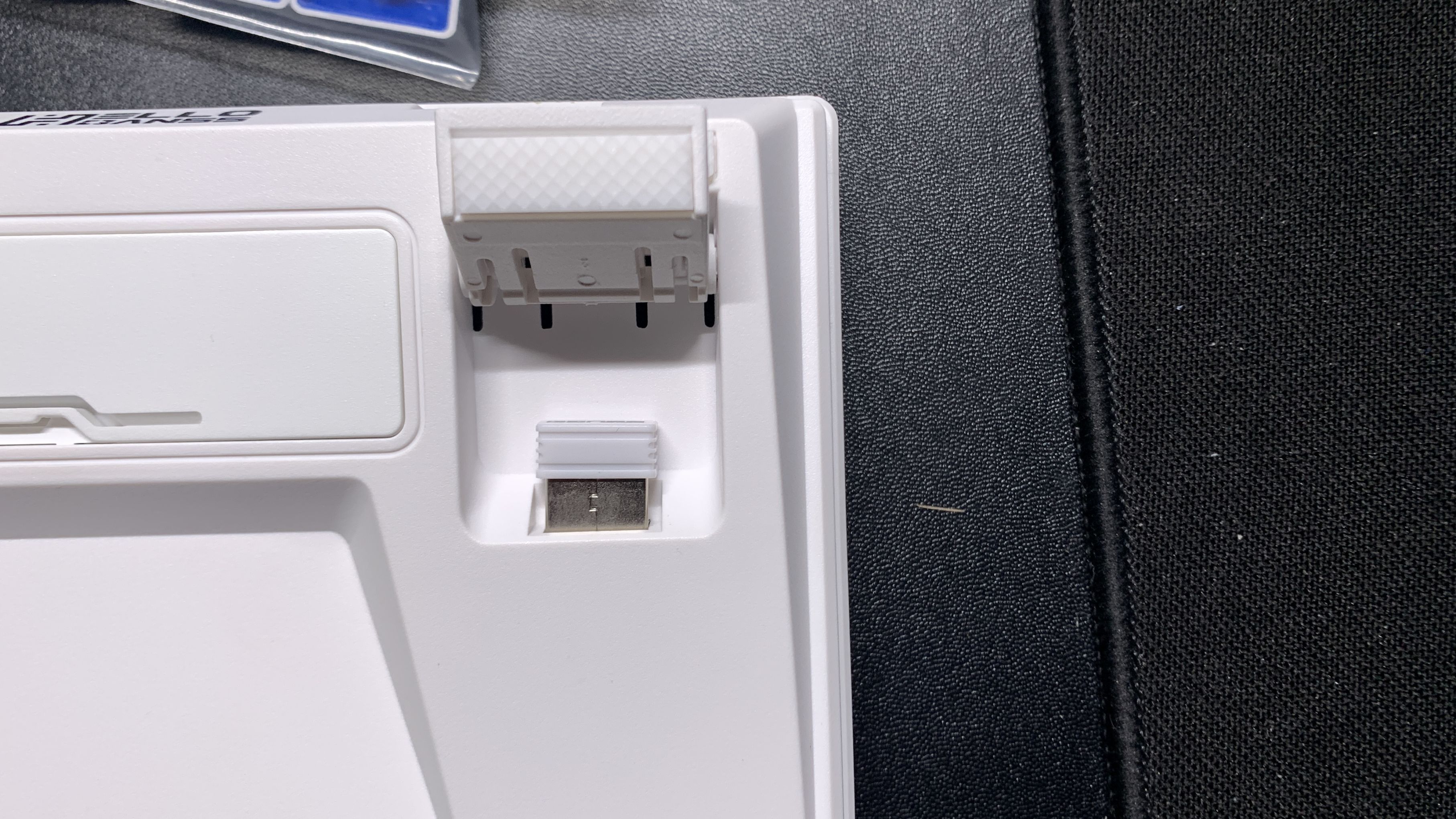 - 收纳仓设计,常规的收纳仓一般设计正底壳,影响美观,但是这把键盘设计在脚撑里面,做了一个隐藏的设计。这个细节可以