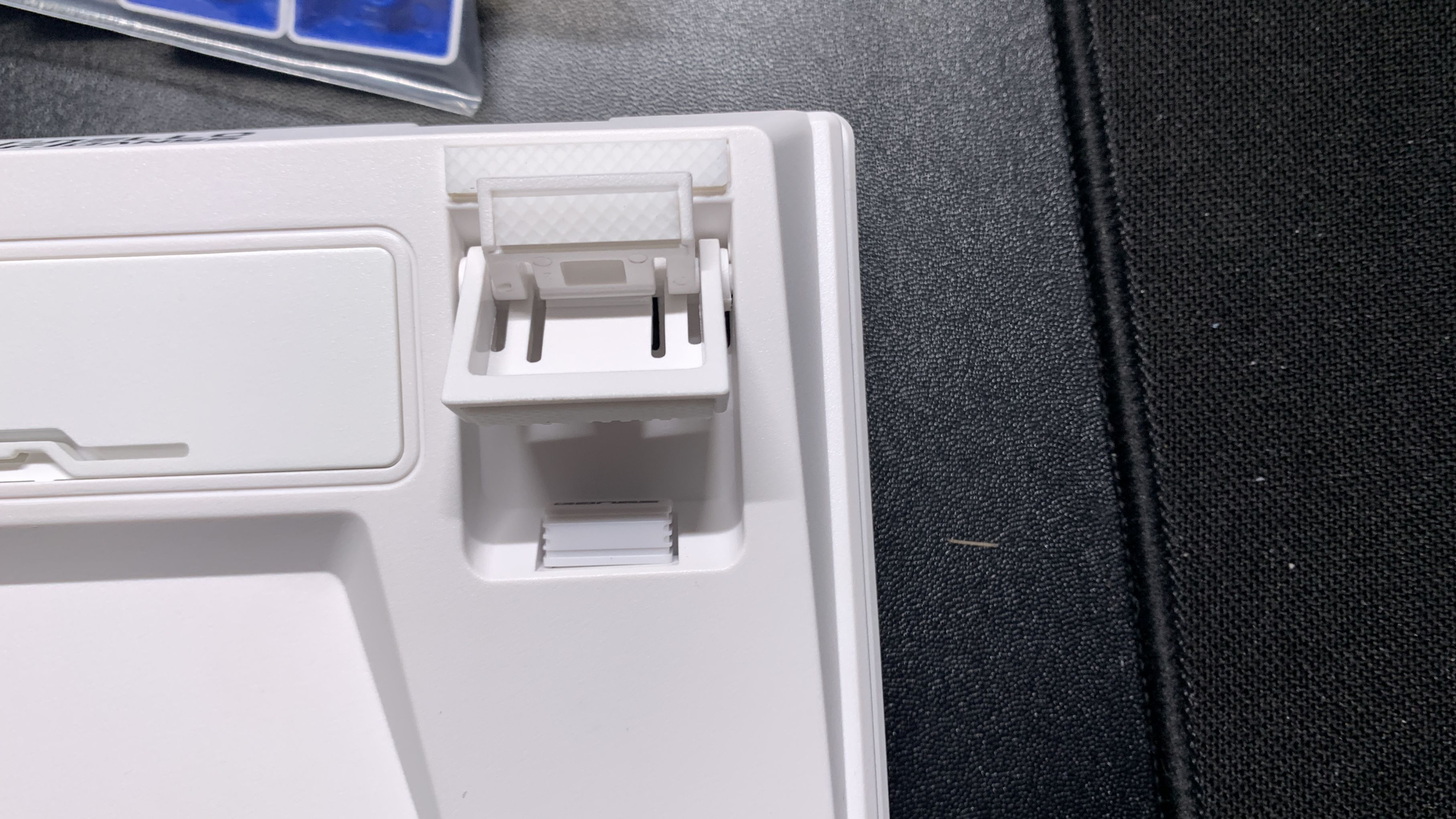 键盘有着一个两段式的脚撑设计,再加上原来的高度,这样子键盘就有三种高度选择,其实这里都是键盘的标配,唯一一点细节的地方就脚撑上面也做了防滑贴的设计,有些五六百的键盘都没有注意到这一点点的细节。