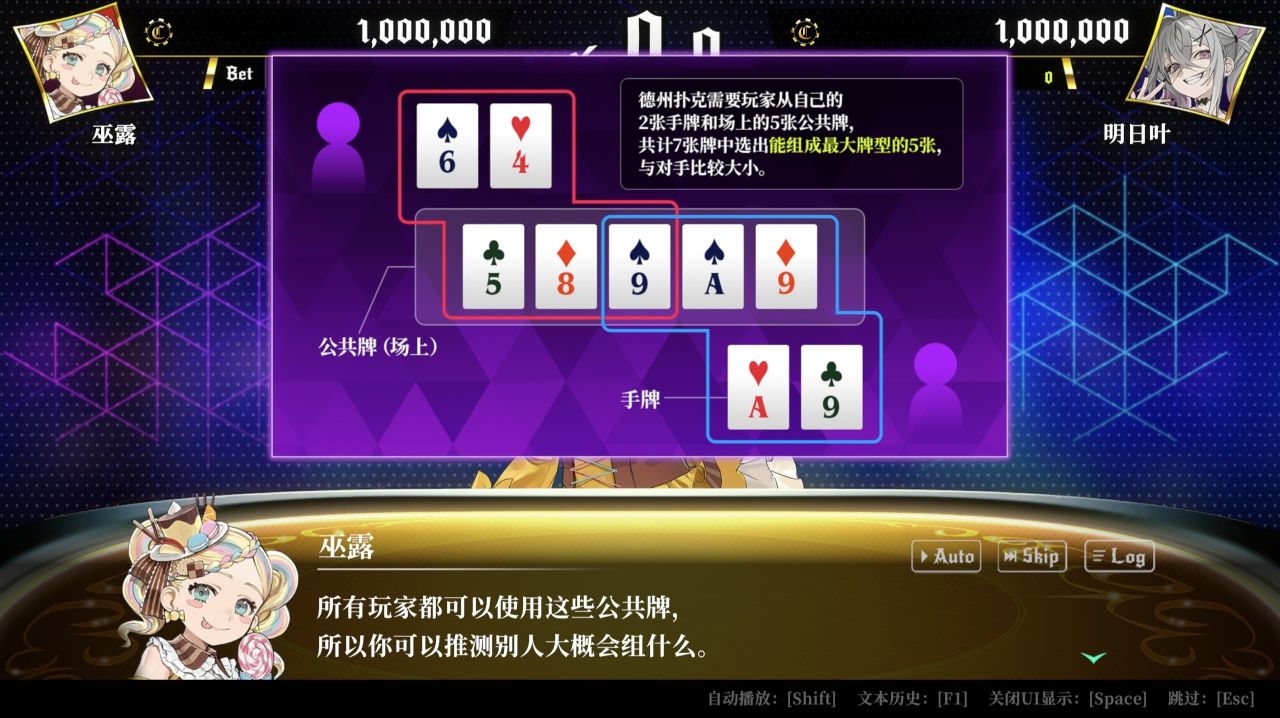 總之就是根據靈感的提醒,組成一套最大牌型的手牌,與對手比大小,多上手試兩把就可以摸清楚如何操作的了,至於該在什麼時候加註或該幹什麼,那就只能看玩家自身的時機把控能力了,掌握合適的時機下注加註,但也要在牌小於對方的時候及時棄牌收手,不可莽撞行事。