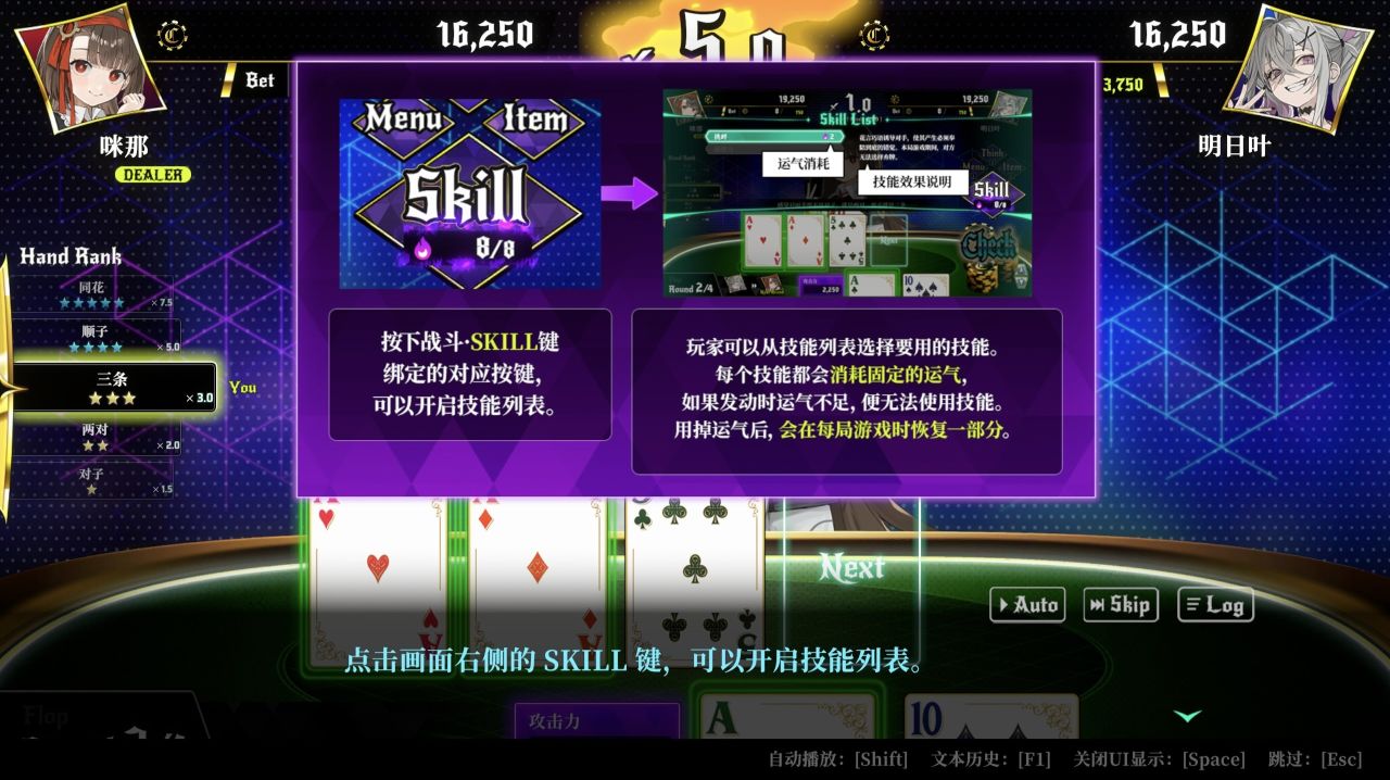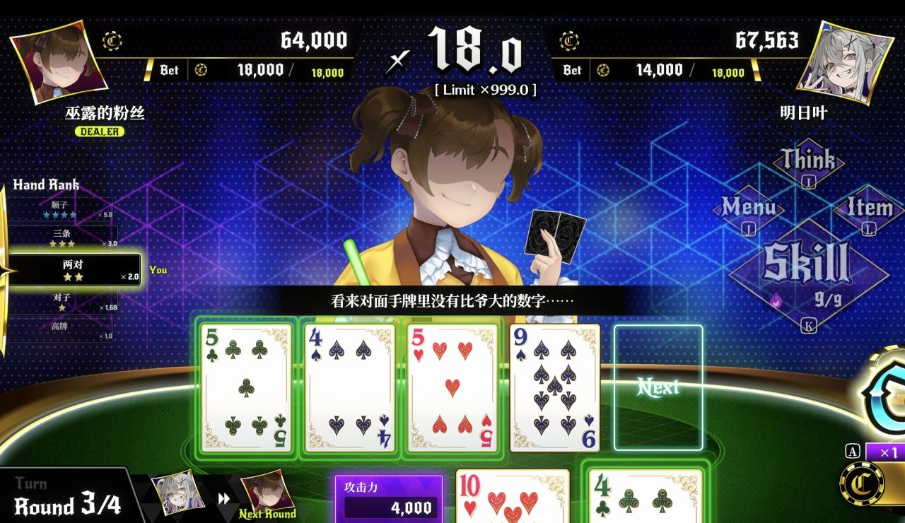 那麼都說咱們是來賭的了,首先總要有個賭的玩法方式,本作選取的就是在賭局裏最經典的“德州撲克”,基本規則沒什麼變動,有些像是簡化版帶技能的1V1紙牌對決,與人機雙人對賭,比魄力,比技能,比千術,比技巧,比運氣。
