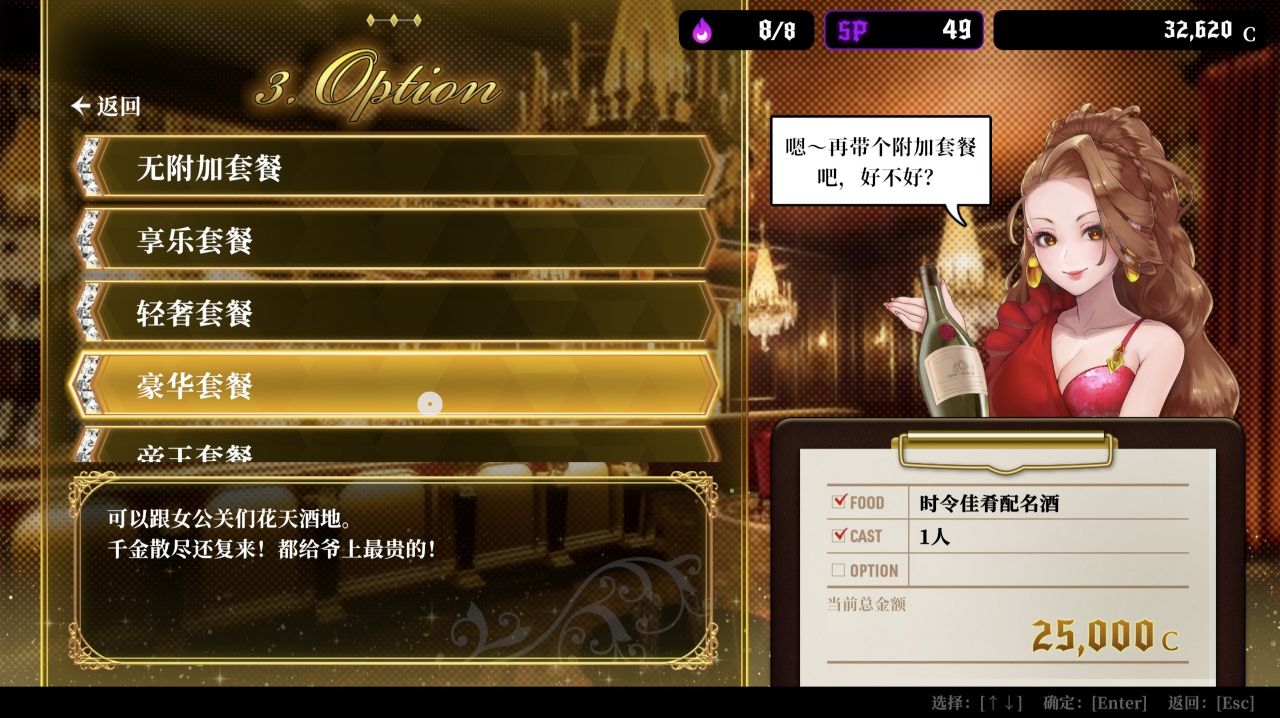 雖說我們不是在賭,就是在賭的路上,但是小賭怡情,大賭傷身,在賭館中掙了錢,還是要適當娛樂一下的,比方說,找美女花天酒地,狠狠享受放鬆一下,當然,享樂區並不只是享受這麼簡單,在這裏享受過後還會提高運氣上限和獲得學習技能的點數,所以要適當享樂哦~
