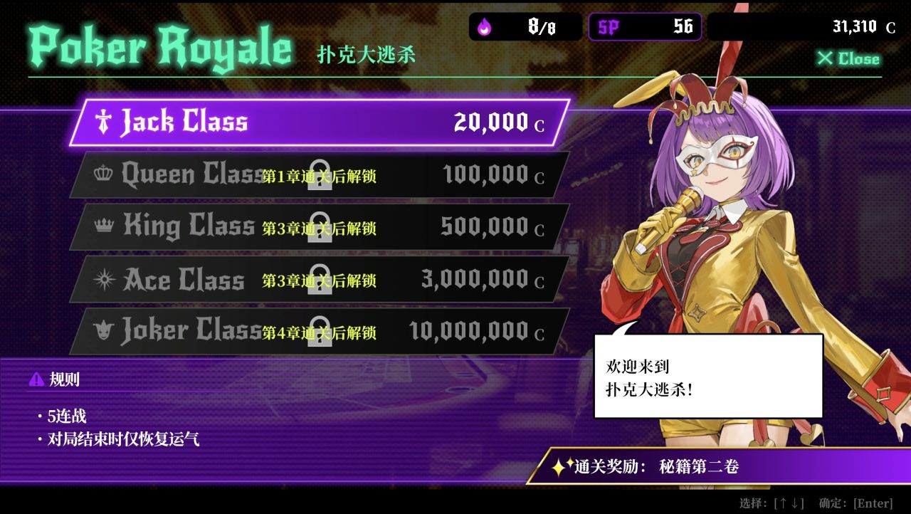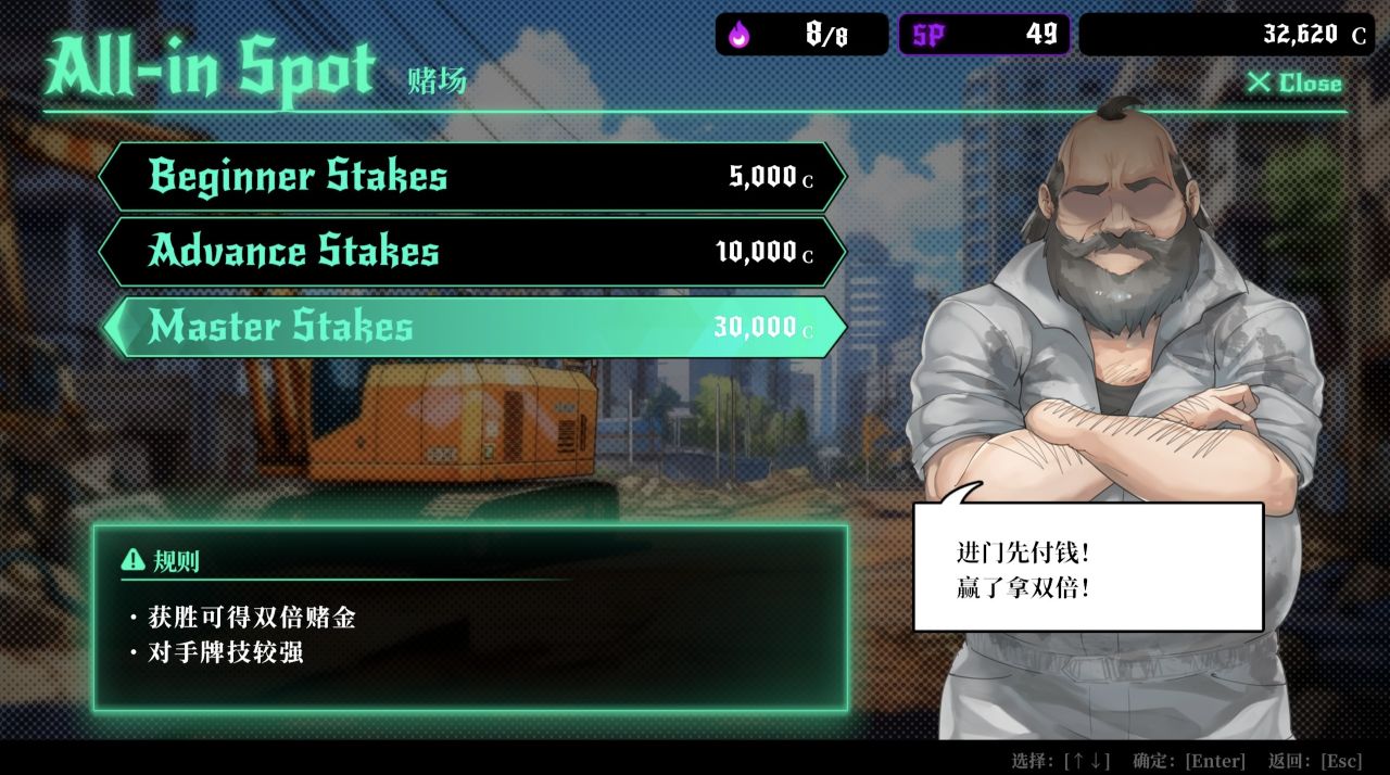 除了與工人對賭,我們也可以選擇參與撲克大逃殺,在撲克大逃殺中,我們將在各個難度下與固定數量的對手連續進行撲克對戰,每次勝利都可以獲得獎勵,如果連勝直至最後,還可以獲得額外的特殊獎勵,在中途放棄可以帶着獲得的獎勵退場,但如果對局失敗了就全沒了,量力而行。