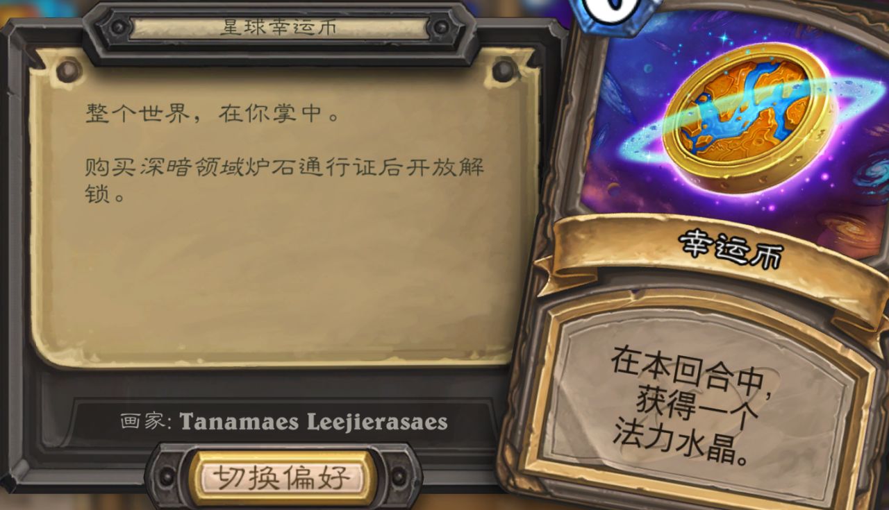 前文提到了深暗領域拓展包講述的是德萊尼人在宇宙中流浪的故事,因此該幸運幣也被設計成爲了一顆星球的樣式。