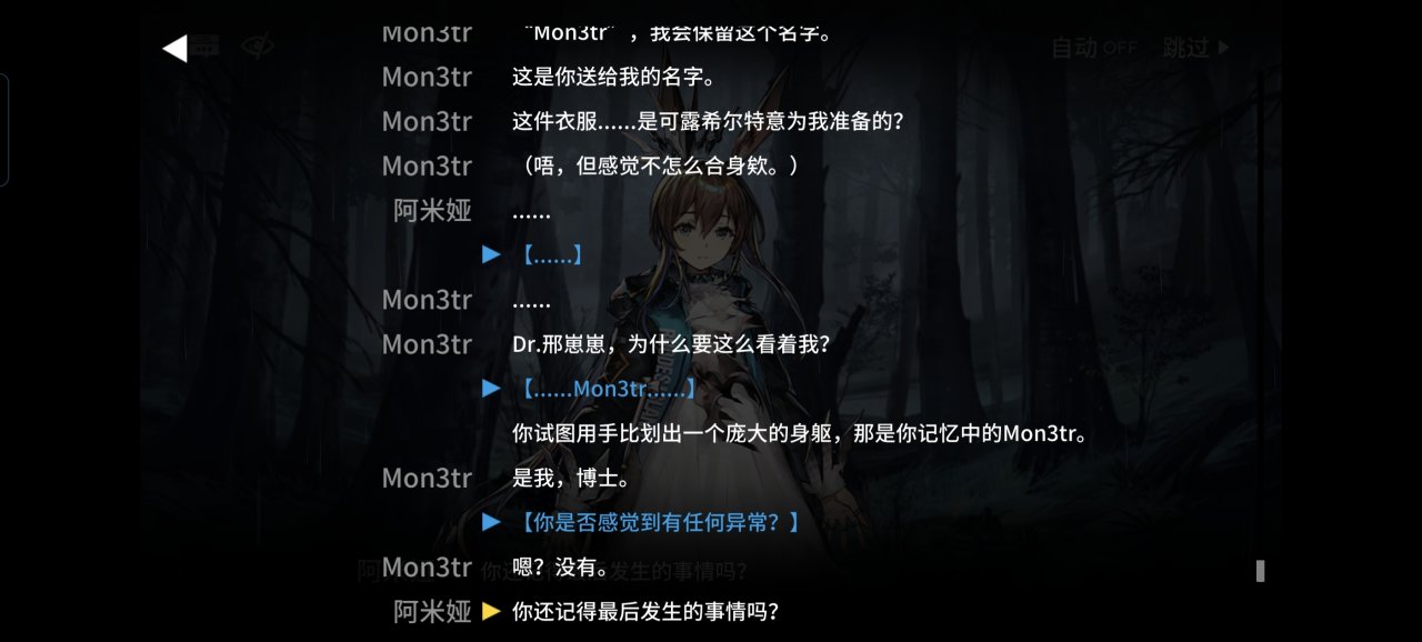 ②在15章劇情最後m3甦醒的時候,說可露希爾準備的衣服不合身,我們看立繪也發現衣服袖子很大,很有可能這個衣服是準備給怪獸形態的m3使用的。