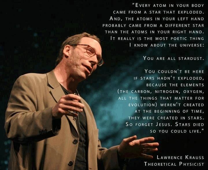 這實在是我所知道的物理學家最有詩意的東西:我們都是星塵…因此忘掉耶酥吧,星星死去了,你今天才能在這裏。