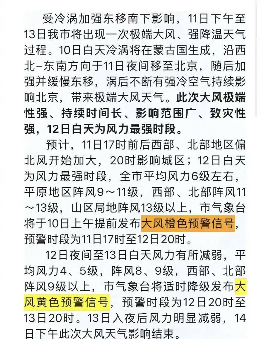 北京市气象台发布消息,受冷涡加强东移南下影响,11日下午至13日北京将出现一次极端大风强降温天气过程。10日白天冷涡将在蒙古国生成,沿西北-东南方向于11日夜间移至北京,随后加强并缓慢东移,涡后不断有强冷空气持续影响北京,带来极端大风天气。此次大风极端性强、持续时间长、影响范围广、致灾性强,12日白天为风力最强时段。