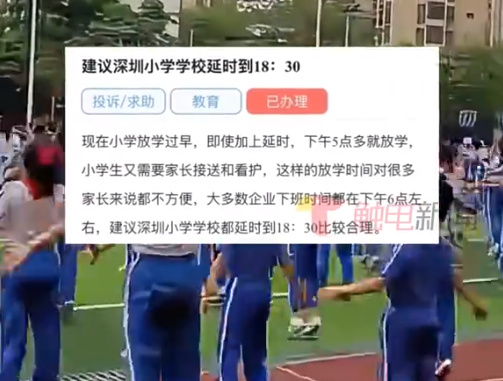 近日,有深圳家长人民网留言板发帖称,小学放学时间早,不方便职工家长接送及看护,建议延时至18:30放学。对此,宝安区教育局作出回应,课后