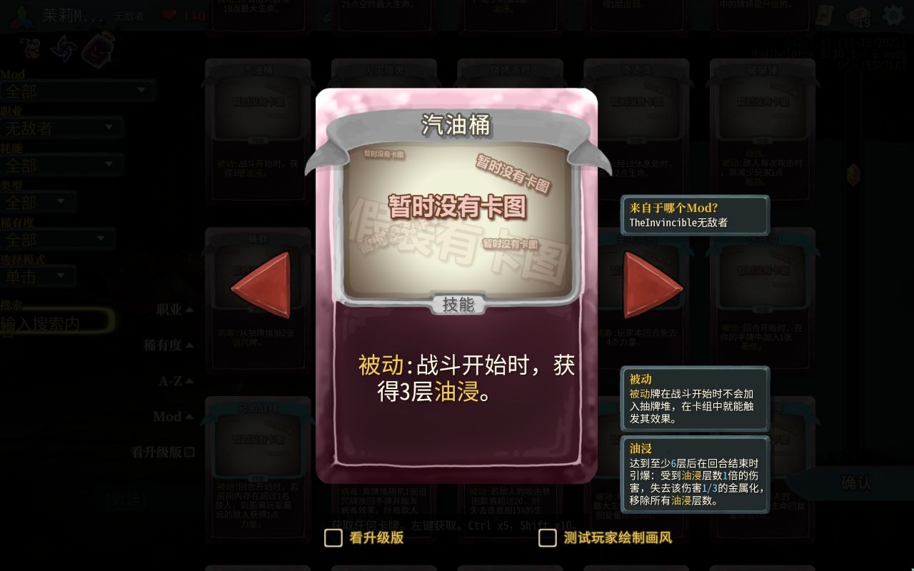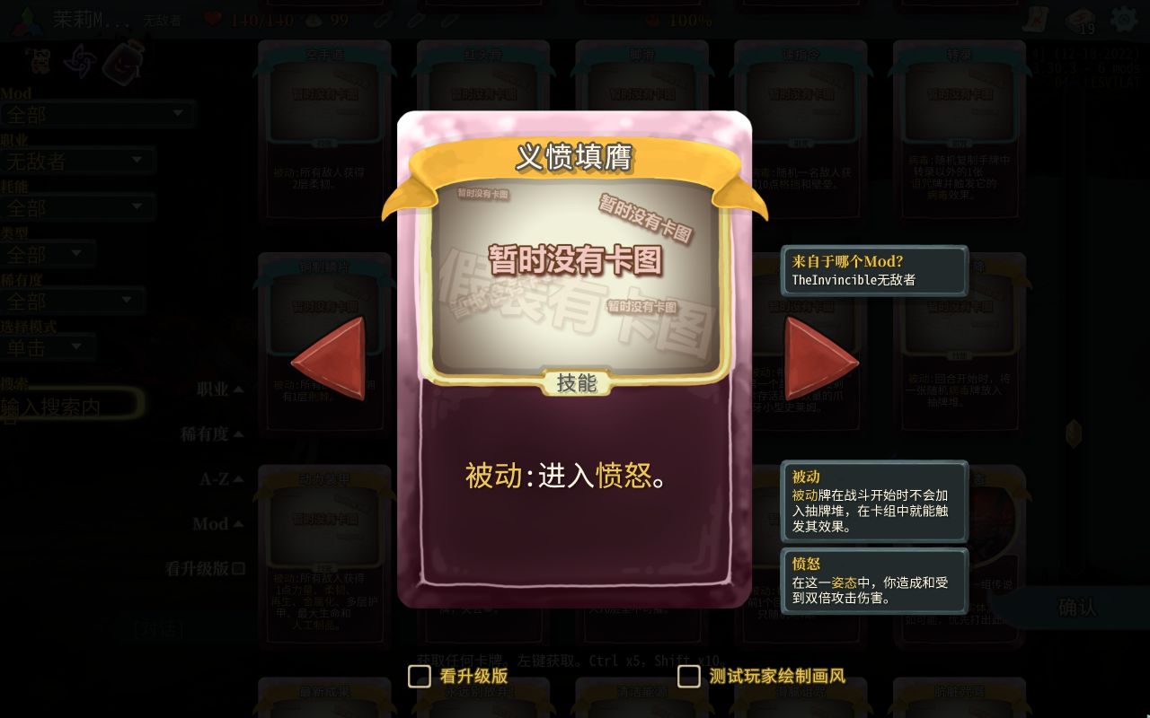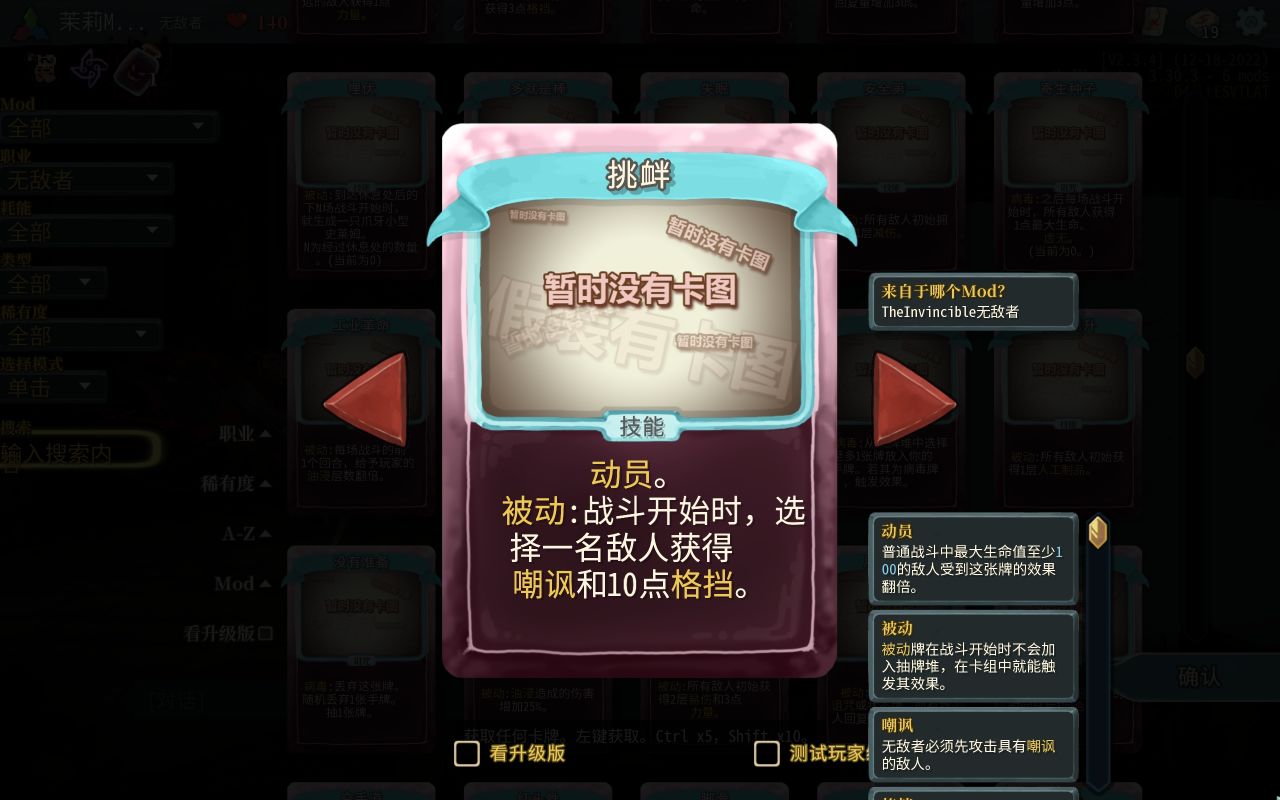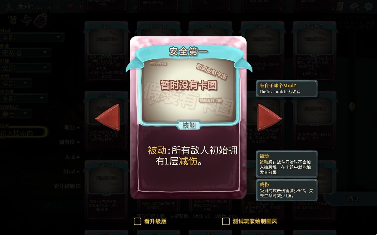 这个mod一反往日的爬塔玩法,你扮演的将不是你选择的角色“无敌者”,而是类似于心脏阵营的角色,你的目的则变成了保护心脏,避免无敌者屠遍尖塔。没错,你的目的不是让你的角色干掉心脏,而是让角色死在心脏面前或者见到心脏的路上。mod上手简单,难度也不算太高,而且因为你扮演的不再是角色,所以你不需要操控他的出牌,可以说是每天睡前来一局,益智不烧脑(饭前也可以来一局,我就是边吃饭边玩的,一个字,爽!)
