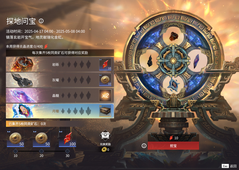 參與對戰開啓落物堆、遊玩徵神之路均可獲得【炎晶】,前往【探地問寶】活動,消耗【炎晶】挖寶,可獲得4種礦石,解鎖多重獎勵!