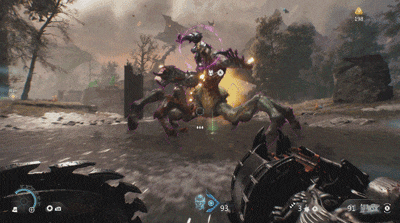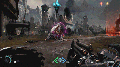 在近戰方面,試玩版還提供了拳套和連枷兩種近戰武器,Slayer 可以在菜單中對兩種武器進行切換,按右搖桿(RS)即可使用,每一擊都會對敵人造成巨大傷害並消耗一次使用次數,而實施完美彈反等手段就能恢復次數。通過升級,近戰武器還會有着類似造成電擊傷害之類的加成,作爲近距離面對敵人時的強力攻擊手段不容小覷。