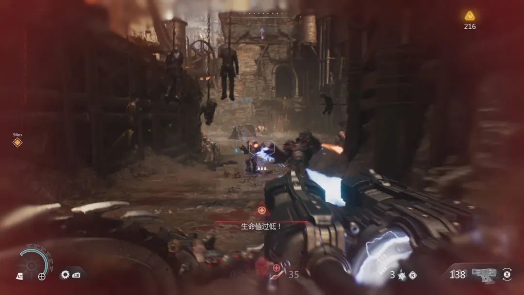 盾鋸是 Slayer 從遊戲開場就不離手的裝備,如果說前作中可以通過高速走位躲避敵人的普通子彈攻擊的話,本作中敵人的彈雨之密集,僅憑機動力有所下降的 Slayer 來說很難全身而退,所以 LT 舉盾的動作就代表了一種應對措施,但這並不是百分百的保命手段,我依舊發現自己的血量會在惡魔的攻擊下不斷減少。