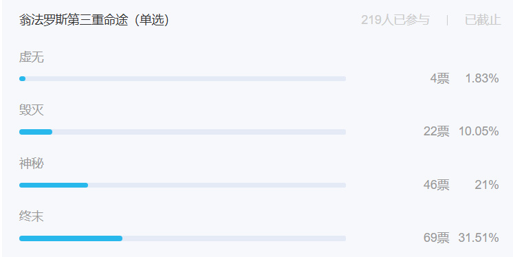 比如在3.1版本結尾爆料的開拓者之死,雖然玩家基本能猜到最後會是虛驚一場,但誰能想到在猜想的當時,開拓者就已經是個“亡靈”了呢?比如翁法羅斯的第三重命途,此前玩家們爭執不下,甚至因爲主角曾經思考過“不要什麼事都推給納努克”,讓不少人首先就在答案中排除了毀滅,在一次意向投票中,只有10%的人認爲第三重命途可能是毀滅。
