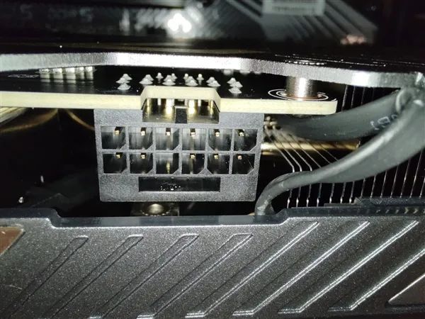 詭異的是,另一張關於顯卡供電接口的照片上可以清楚地看到,有一根針腳“不見了”,推測是插入電源線的時候,這根針腳被推了進去,導致接觸不良甚至完全沒有接觸。