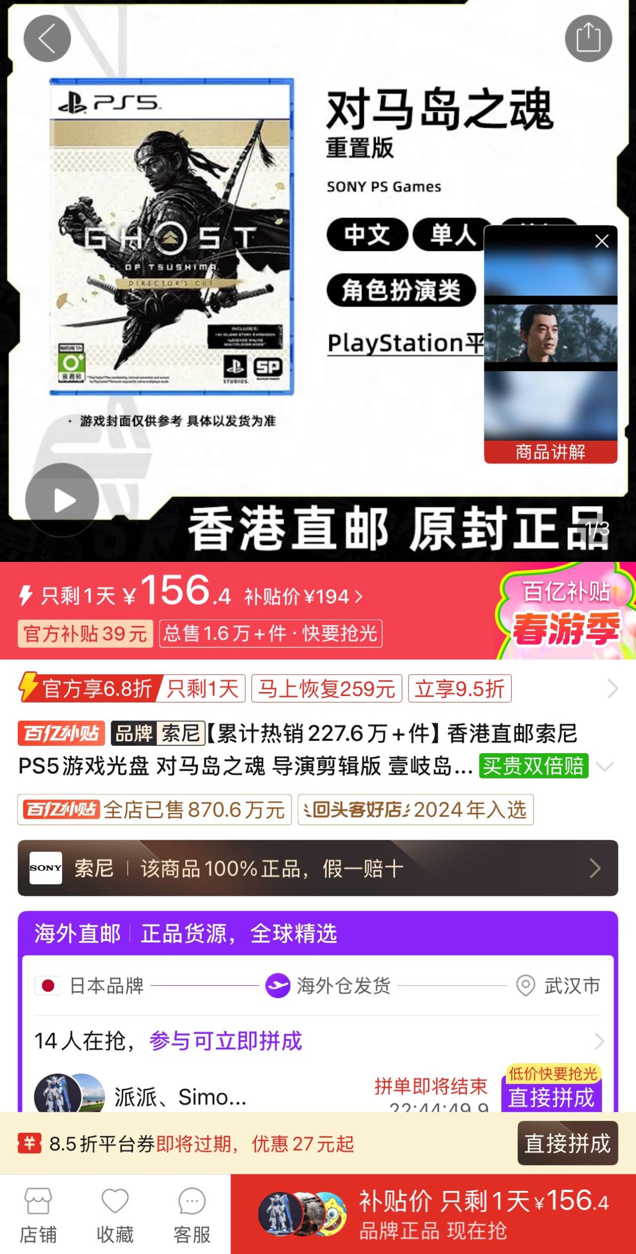 4.PS5遊戲《對馬島之魂:導演剪輯版》港版中文全新156.4元包郵,現在這個價格已經不錯了,再跌也跌不到哪去了,畢竟還有PC版再那頂着,推薦給想要收藏一張實體版的朋友或者PS5新玩家可以買。