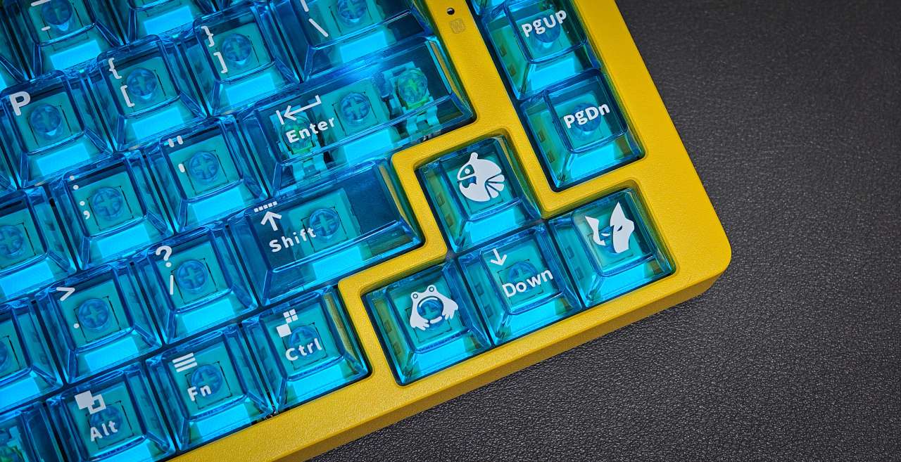 裝完以後的效果就是這樣的,不開燈跟開燈的效果都很棒,鍵帽的手感不錯,比較細膩,裝之前我以爲藍色配合黃色會特別的醜,但是裝完以後竟然意外的還不錯~