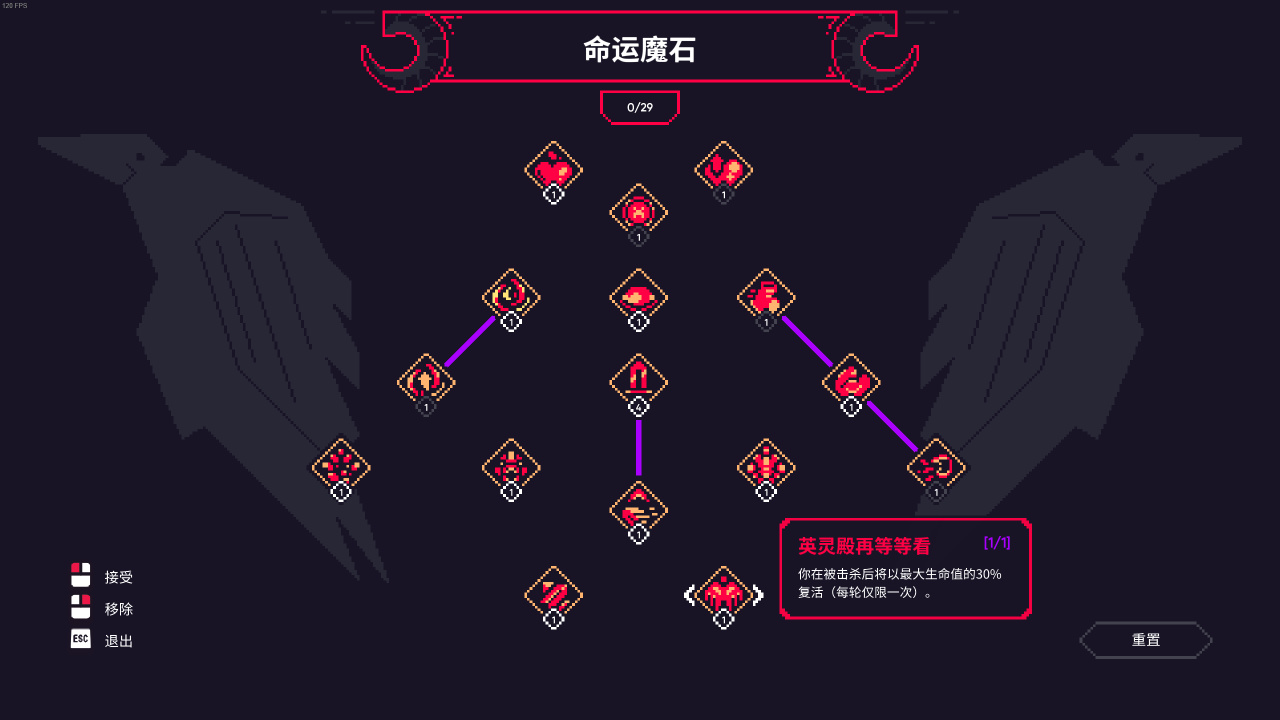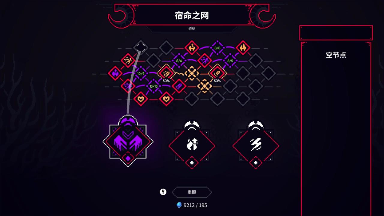 而角色提升至單數級時則是會觸發“宿命之網”升級,玩家需要從三個織結中選擇一個放置在看起來是九宮格實際上單一節點至多隻能與六個節點相連的棋盤格上,使角色的性能獲得進一步的提升。(基本套路就是減CD堆攻速,成型之後帶上吸血技能就能輕鬆殺穿全圖啦)