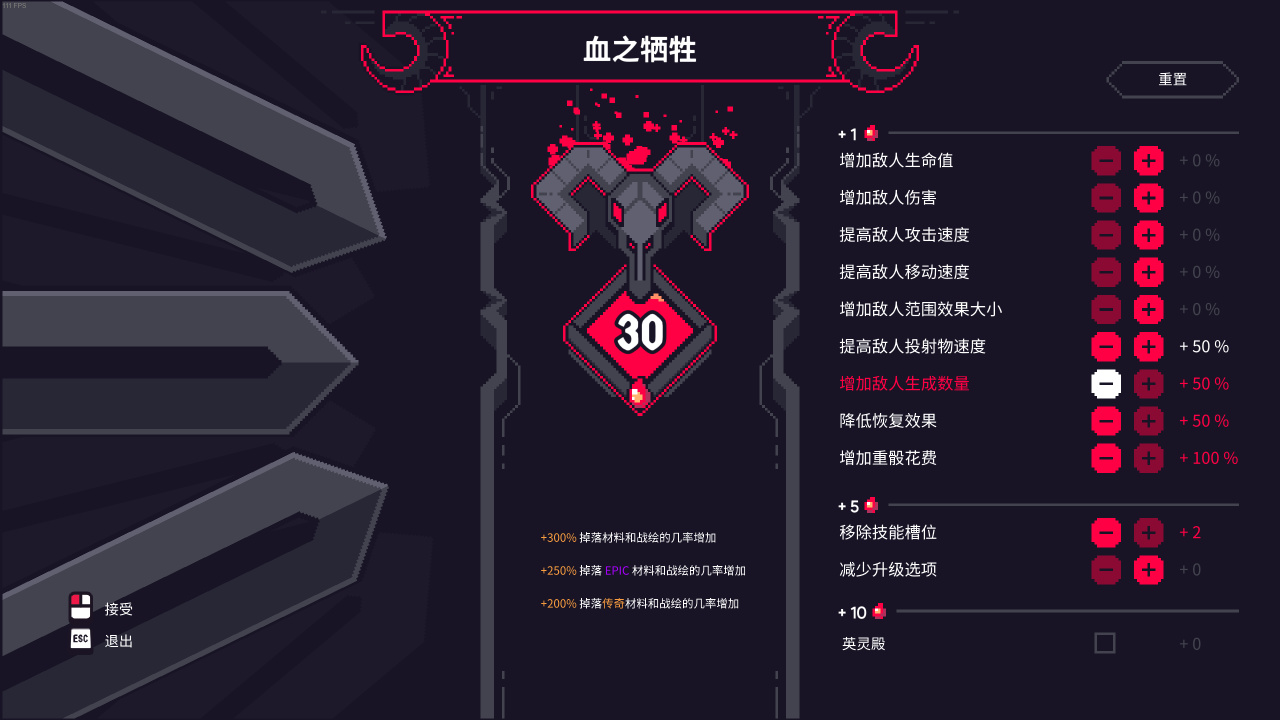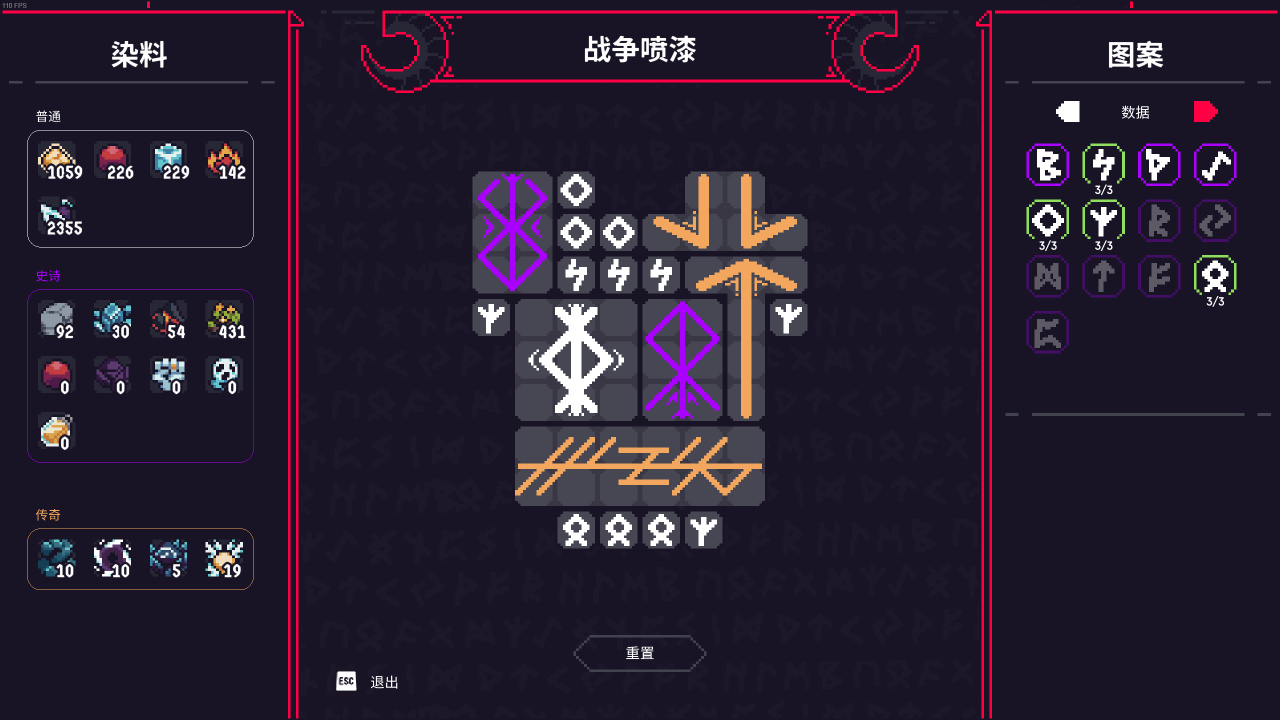 其中,戰爭噴漆爲三個角色共用,玩法基本上可以等同於揹包整理小遊戲。符文會隨關卡掉落,也能通過合成取得,放置時可旋轉;合成材料可以通過在不同關卡中進行遊戲(鼠標移動到需要的材料上時能看到對應的關卡)或分解符文獲得。玩家可以經由調整“血之犧牲”中的遊戲難度選項(每通關一次上限+5)來提升材料與符文的掉落率。