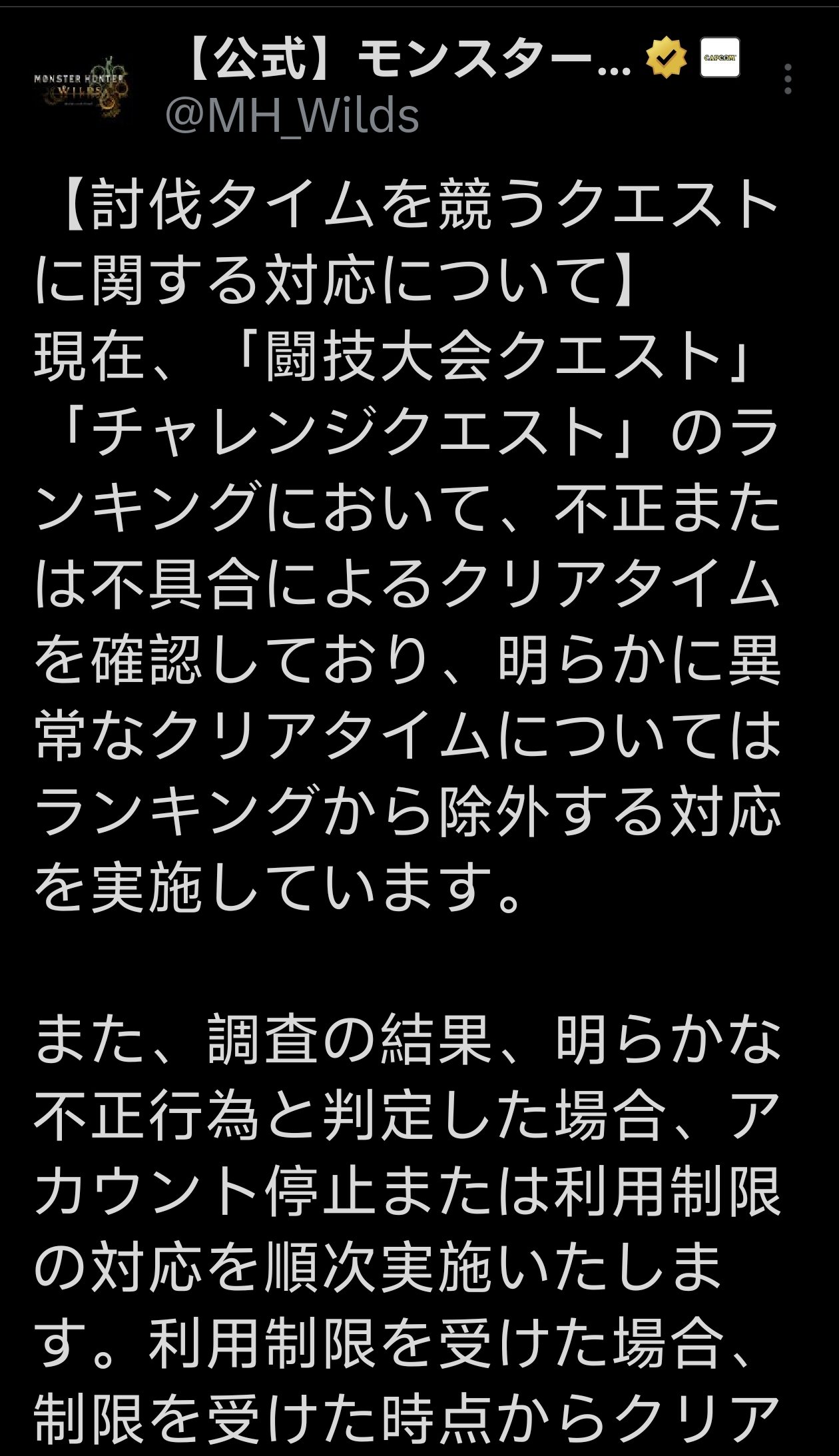 另外,針對此前鬥技大會出現的 0 秒擊殺異常狀況,卡普空也通過公告提醒,這些疑似通過不正當手段或利用系統漏洞的行爲,可能違反最終用戶許可協議(EULA)第 8 條中的禁止事項,將對違規賬號採取封號或限制措施。