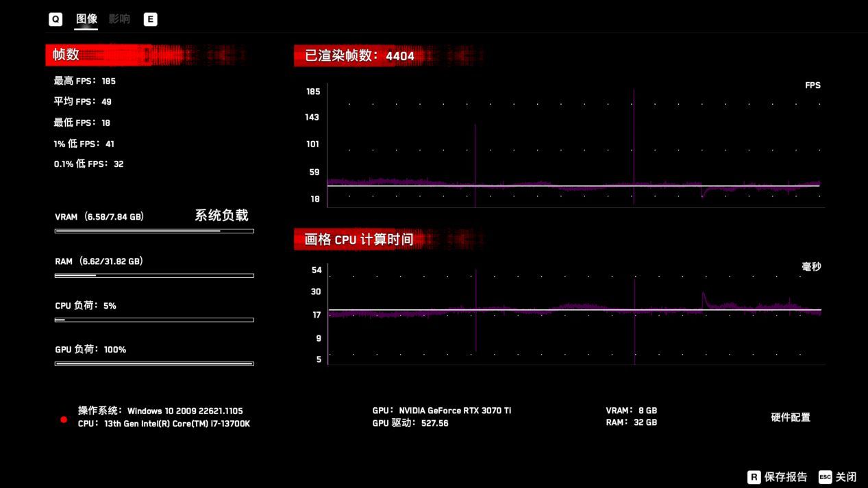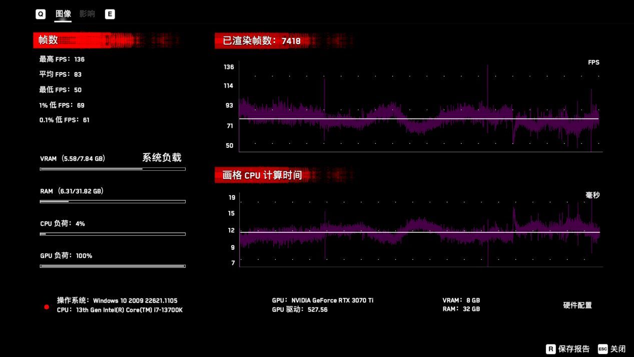 4K平均36幀那肯定是無法暢玩的,不過DLSS大法好,開啓DLSS性能後,幀數可以提升到63幀,至於4K體驗光追,3070Ti肯定是指望不上了。