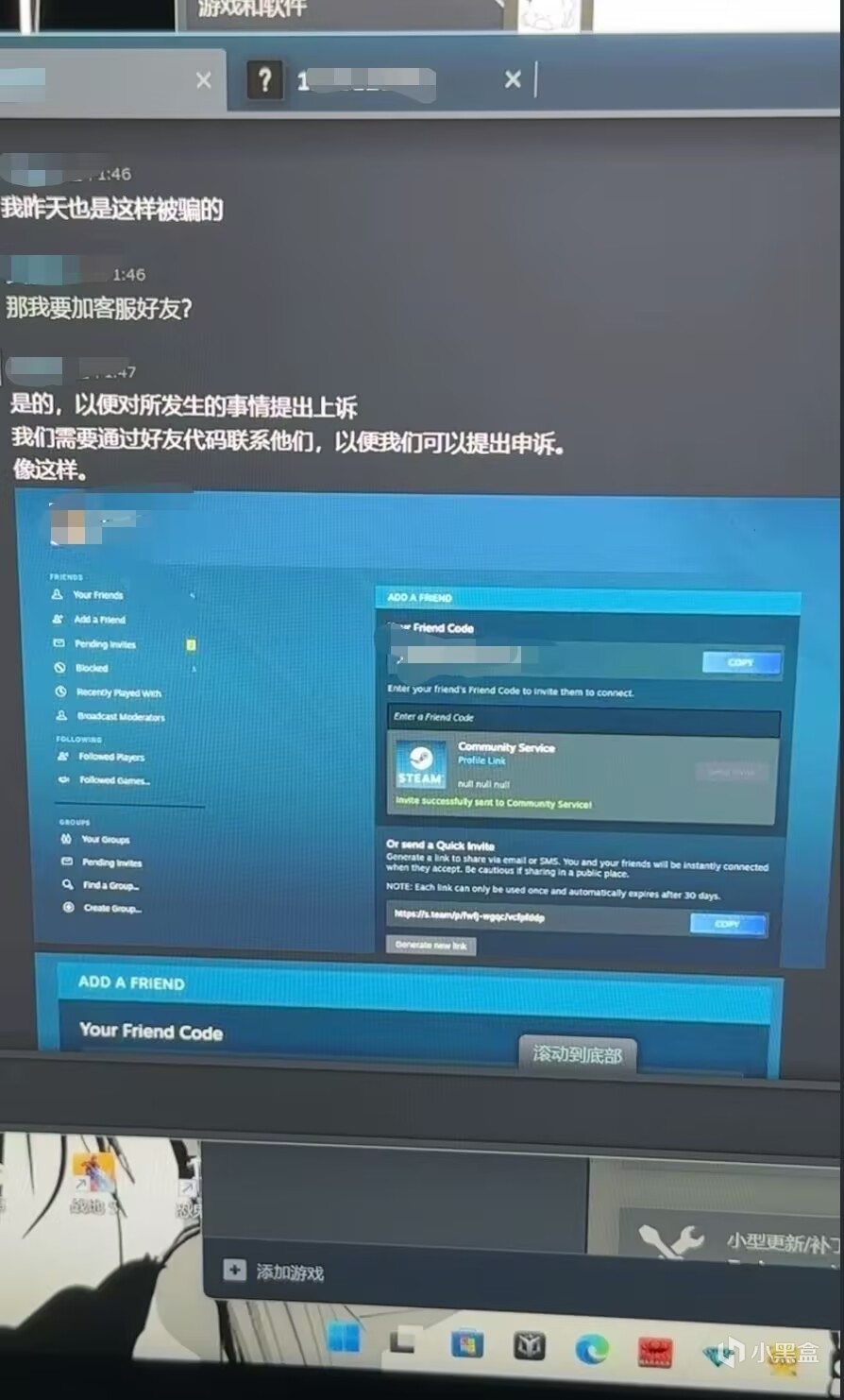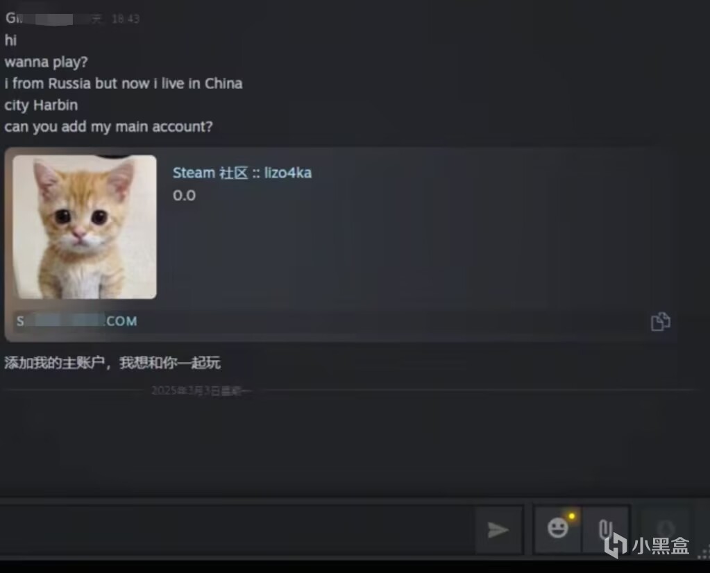 4 加你好友(多是妹子),很主动,让你加她的姐姐的号,会一开始发你好友码,但是根本搜不到,你发你的好友码,她也说搜不到,这时间她会发一个链接让你点进去加,但是其实这只是一个非常像Steam的网站,域名也和Steam的不一样