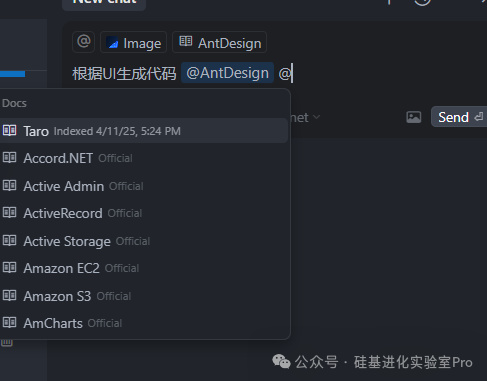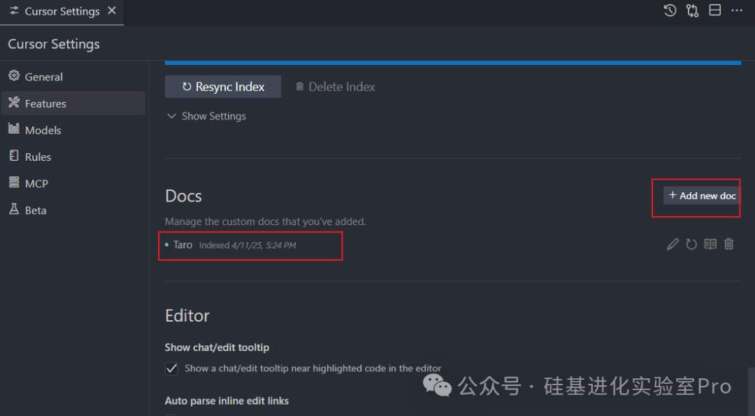 Cursor已经内置了很多常用的文档库,如果没有你可以自己添加,比如我上面添加的Taro