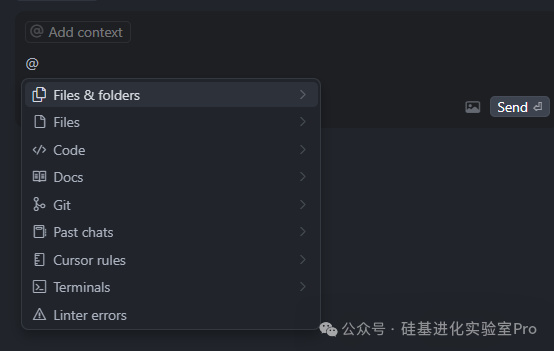 Cursor中有多种添加上下文的方式:拖拽、快捷键、@1.最方便的还是拖拽