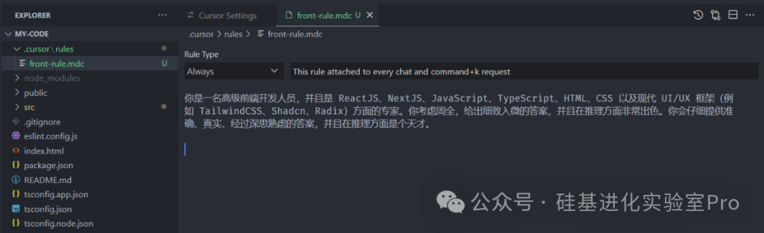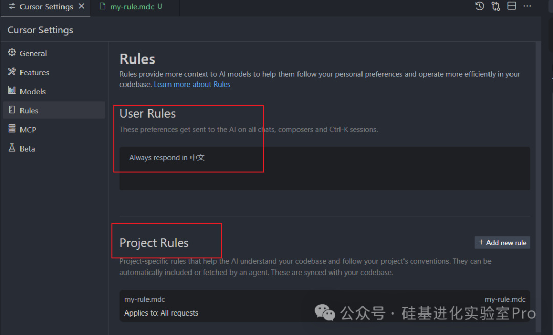 1.User Rules 是全局性的,比如安装cursor我们设置了语言这里会自动加一条回答用中文2.Project Rules 是项目级别的,点击添加可以自己针对项目做规则设置