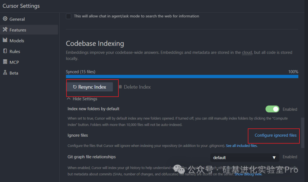 Cursor的 codebase index 功能的作用是会扫描并索引你的整个项目代码,让 Cursor 可以理解和引用你的代码库,可以基于整个项目的上下文,为你提供更准确的代码补全、错误检查和重构建议。当你发现Codebase没有完全同步你的代码库时,你可以选择手动同步。操作流程:进入Cursor设置页面 -> 【Features】找到【Codebase indexing】-> 点击【Resync Index】如果你不想一些核心文件或无关文件被Cursor索引,可以将它们添加到 ignore files中