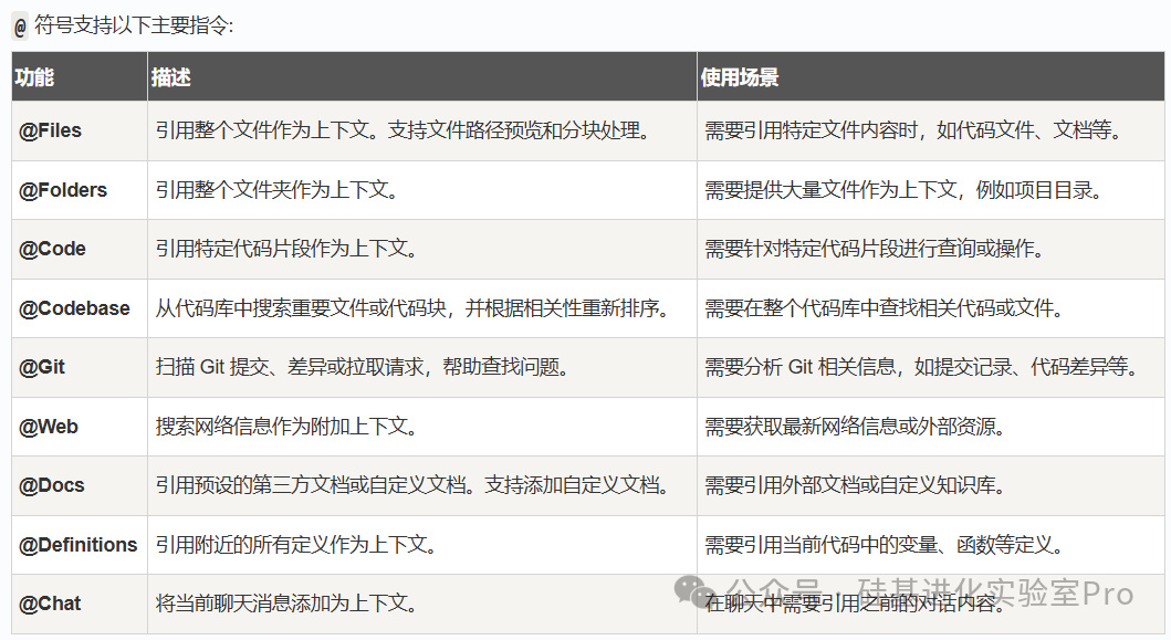 Cursor 允许用户预设参考文档作为知识库并为文档生成索引方便用户快速检索,配置好 Docs 后可以在 Chat 和Composer 中通过@方式使用。