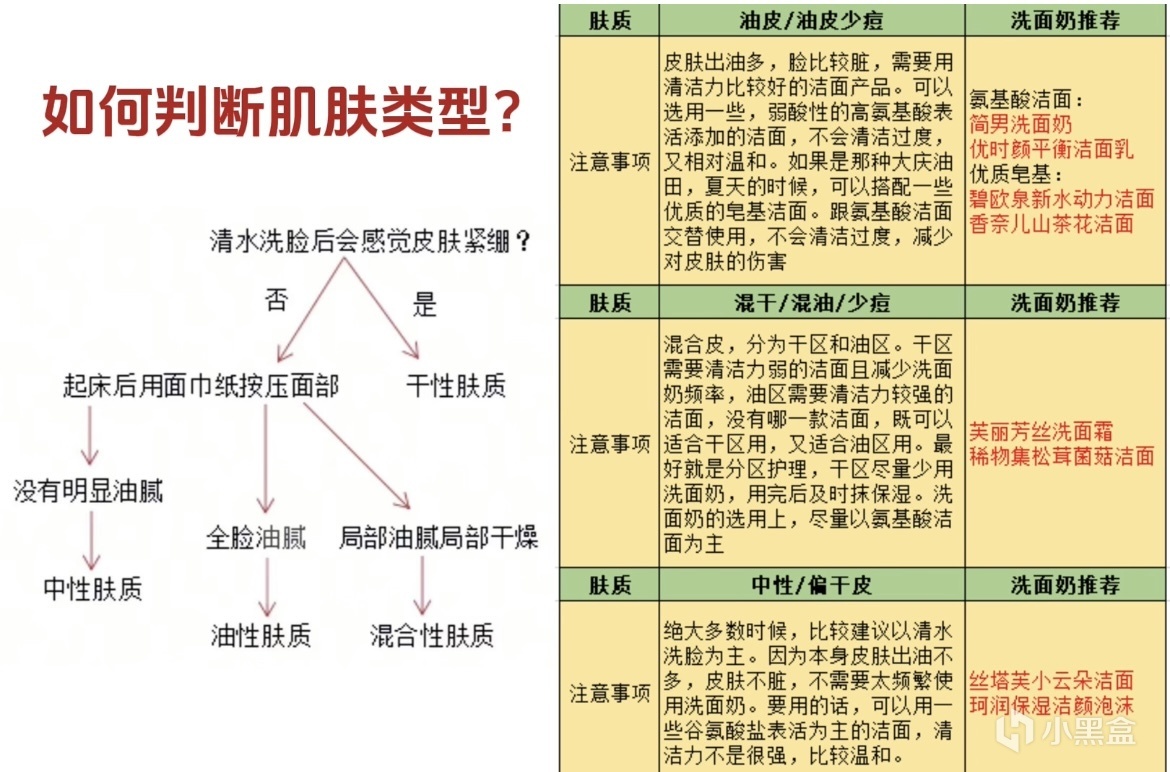 第四點,如何選擇洗臉產品?這裏可以分爲兩種,第一種,健康的皮膚,不長痘或者偶爾長痘,少痘(不超過10個),皮膚不幹燥,不泛紅,不瘙癢,不會因爲環境變化,易敏感刺激,沒有炎症,那基本可以定義爲健康皮膚。那這種,就可以像視頻開頭說的,按照肌膚類型選擇,可以根據這個樹狀圖,簡單判斷肌膚類型,然後根據表格指引,選擇合適洗臉產品。需要注意的是,膚質不是一層不變的,它會隨着季節溫度外界環境的變化而變化,一般表現爲,天氣熱的時候偏油,天氣冷的時候偏幹,洗臉產品,也需要根據皮膚狀態,適當做調整,必要時,需要根據後續的保溼工作。