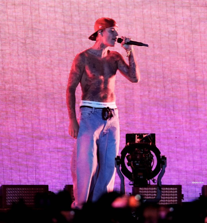 比伯的“邋遢穿裤”风格并非首次出现。例如,在2022年的科切拉音乐节上,他赤膊登台表演时,穿着浅色宽松牛仔裤,刻意露出代言的Calvin Klein内裤边缘,搭配满身刺青和腹肌,展现出荷尔蒙爆棚的形象。