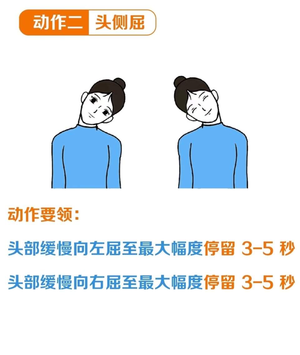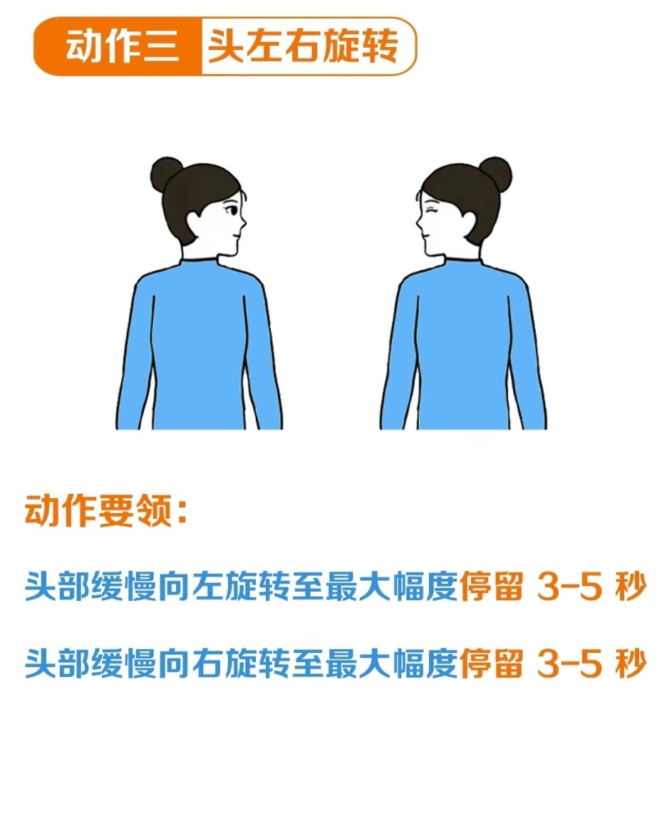 頭旋轉👉🏻 動作:慢速左轉盯左肩,停5秒;慢速右轉盯右肩,停5秒。