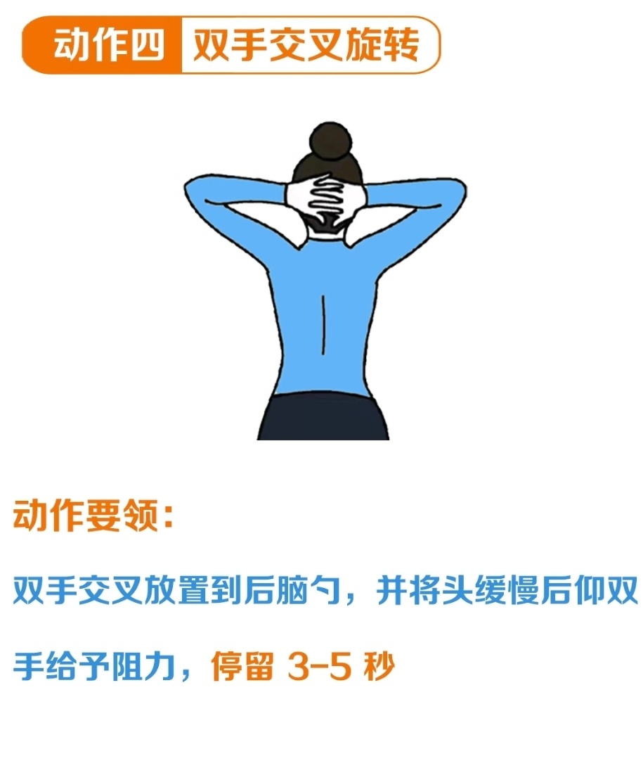 雙手交叉抗阻:👉🏻 動作:雙手扣住後腦勺,頭後仰時用手輕推對抗,停5秒。