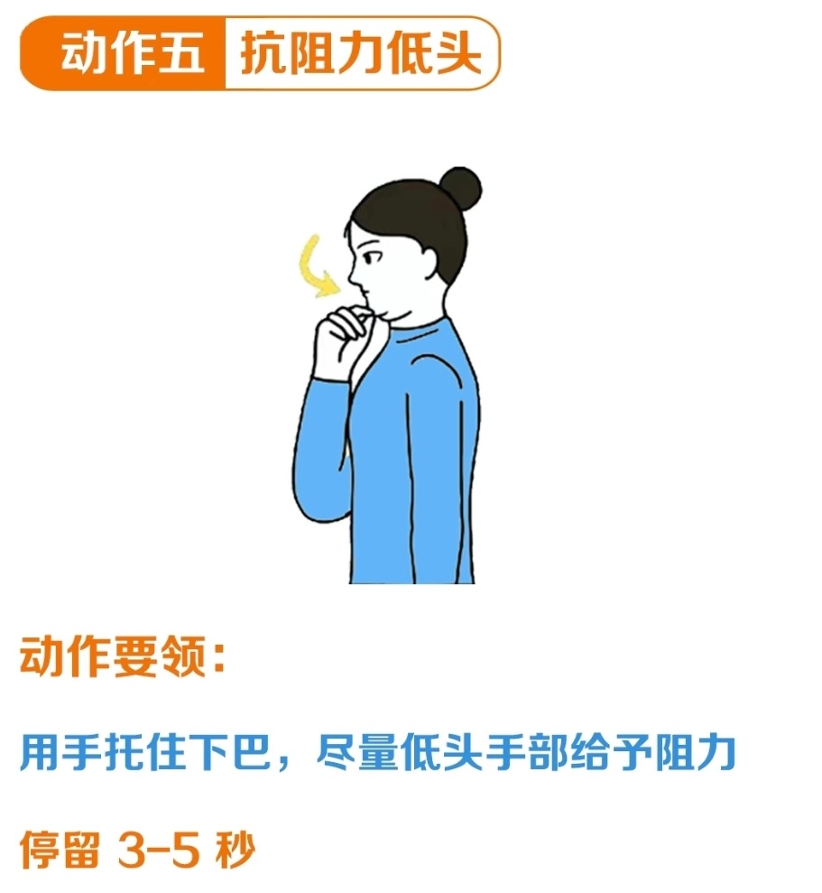 託下巴低頭:👉🏻 動作:手託下巴,用力低頭對抗手的阻力,停5秒。