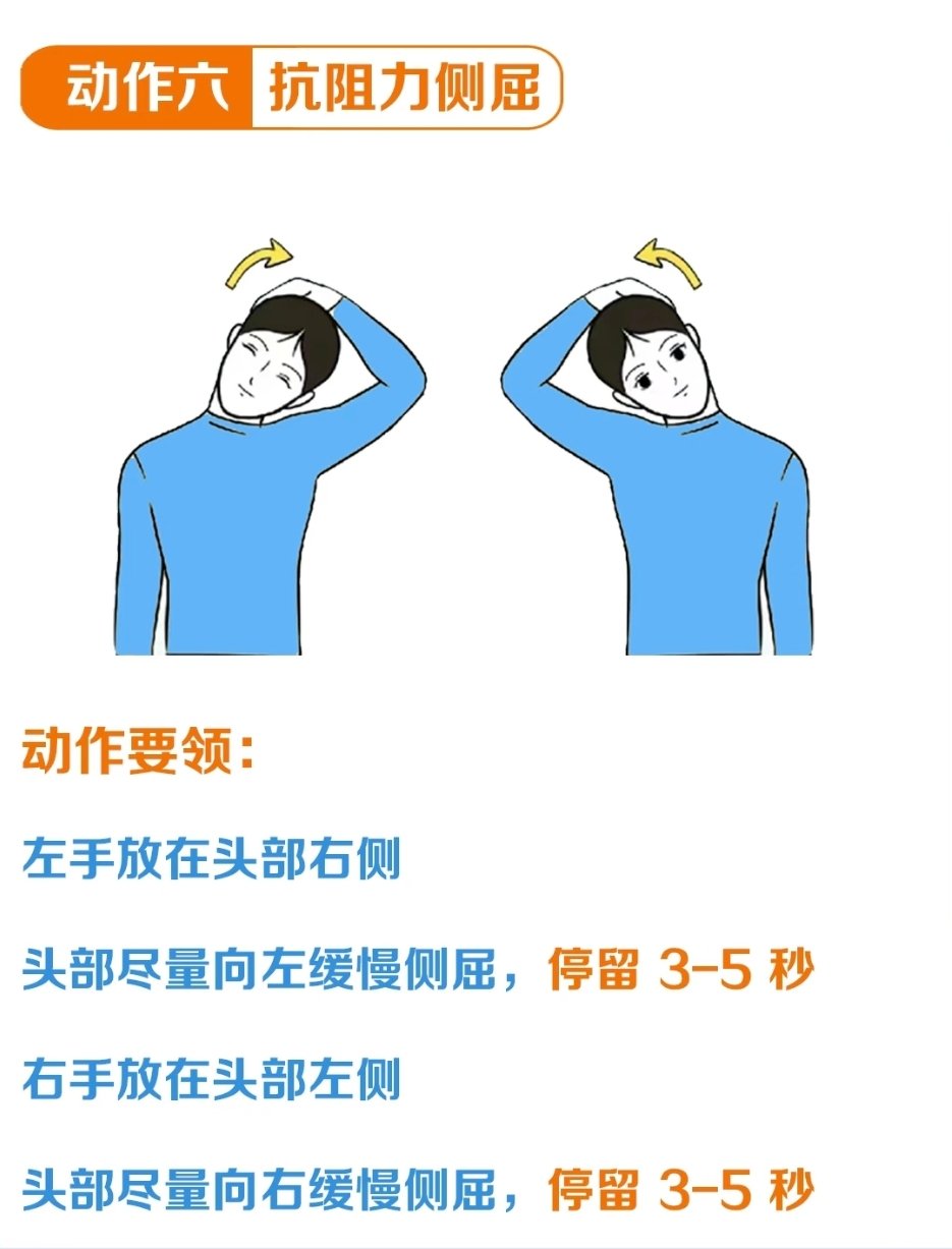 左右對抗側屈:👉🏻 動作:左手抵右頭,頭向左緩慢側屈對抗阻力,換邊重複。