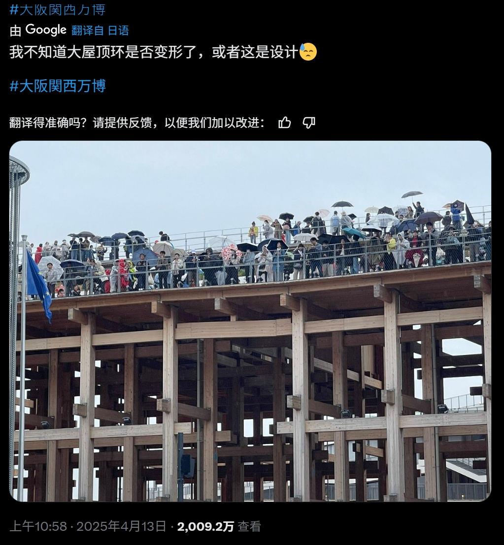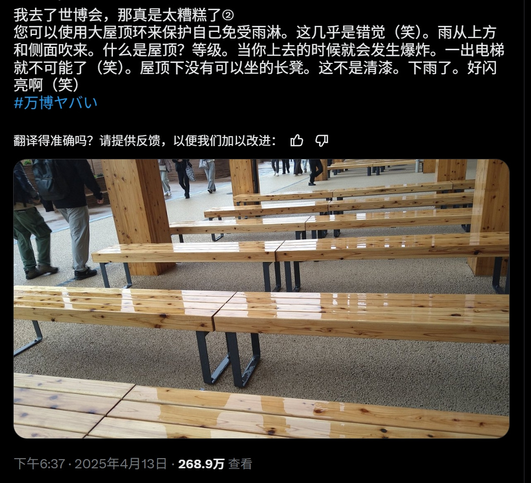 当然,整个世博园里最引人瞩目的,还得是当初号称只使用传统工艺建造,尽显“匠人精神”,甚至还被日本政府拿去申请了“全球最大木质建筑”吉尼斯世界纪录的地标建筑——周长两公里的环形木质屋顶,但它在正式投入使用后,也出现了各种问题。除了之前试运营时就暴露出的木柱有裂纹和并非百分百遵照传统技艺建造外,展会开幕的第一天里,就有不少网友吐槽这个本该用来遮风挡雨的屋顶,实际“遮了个寂寞”——雨水照样可以打湿屋顶下的座椅,拼接的木质结构没有任何防风设计,使得游客们虽然能在底下躲雨,但还是会被冷风吹个透心凉。