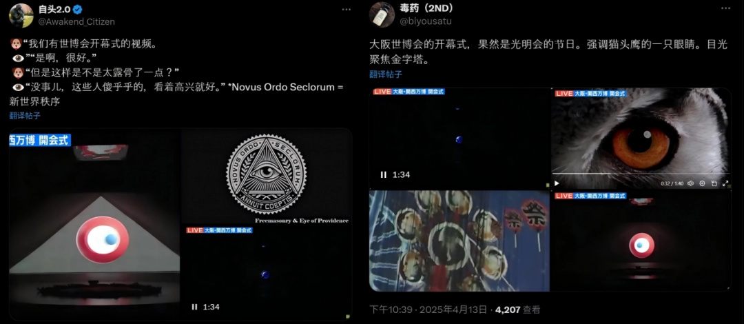 开幕式结束后,不少日本网友也在X上发文吐槽这次诡异的开幕式,甚至还有人因为现场大荧幕上不断出现的吉祥物“脉脉”的眼睛,而将其与光明会等阴谋论搭上关系,在网上开始了二创整活。