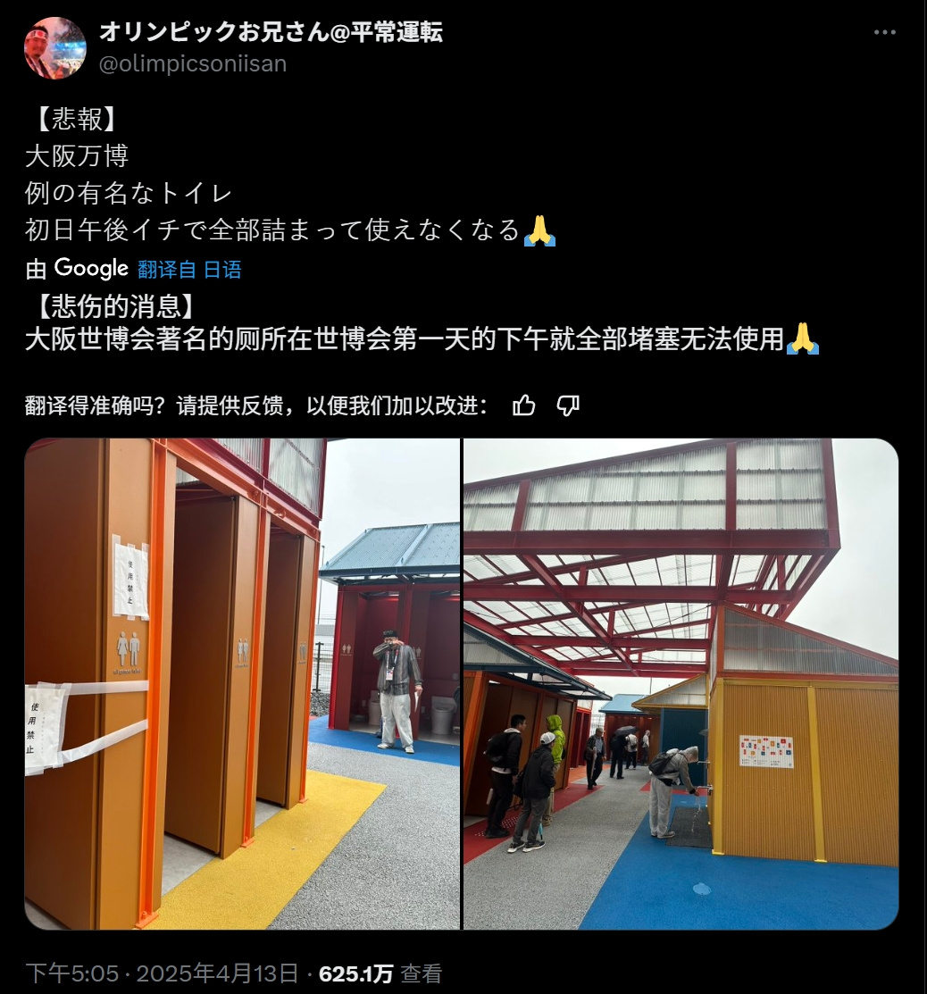 除此之外,整个世博园内受到游客吐槽最多的,无疑就是号称花费2亿日元高价打造的公共厕所。实际到现场一看,它既没有多豪华的装修,也没有多智能的设施,只是一些被涂上了不同颜色类似集装箱的铁皮房子。据说,这么设计是为了支持环保和LGBT群体,里面既没有洗脸池,也没有烘干机,游客想要洗手还得专门去外面墙上的水龙头接水。而即便如厕的环境如此恶劣,这些厕所还是在开园的第一天,就因为下雨而遭遇了管道堵塞,直接被禁止使用。