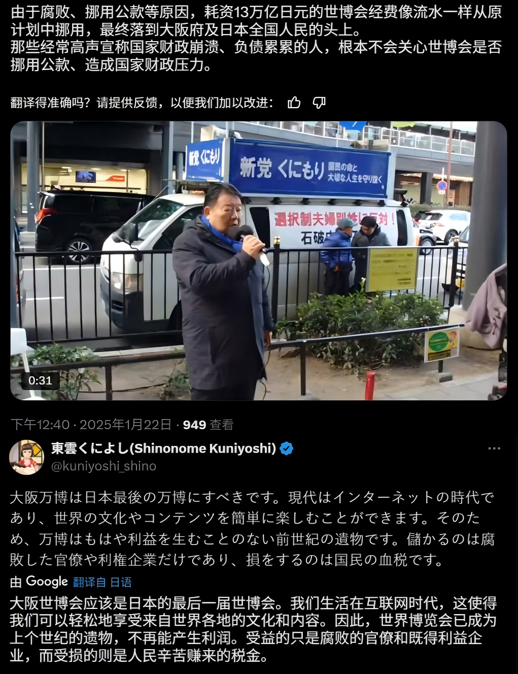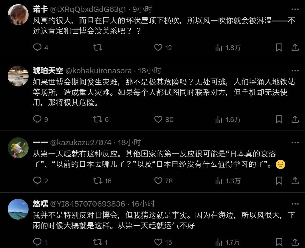 不仅如此,不少日本网友也在网上发文,对本次世博会存在的合理性表示质疑。在X上搜索“万博腐败”,可以看到不少人都在抗议这次世博会的铺张浪费。翻了几倍的预算投入,实际成品的豆腐渣工程,这些成本转化为税收,最终还是要落到广大日本普通民众头上,虽不至于说是劳民伤财,但起码多数普通人都不愿见到如此高额的投入,最终换来的却是如今开幕后的种种荒唐景象。