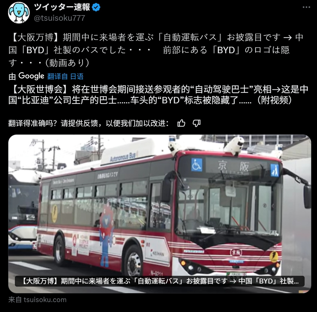 想要快速到达园区?没问题,官方专门为游客们开通了巴士专线,只是这个巴士大概率是日本从中国进口的,毕竟方向盘上还留有比亚迪的LOGO,再在里面加些灯带,就被拿来宣传是日本自动驾驶的高科技产品,让人不得不怀疑此次世博会的筹办团队里,是不是混进了海对岸的南半岛人民。