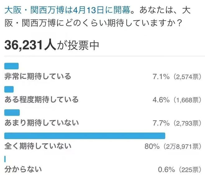 比如,在此前的一次网络民调中,不愿意去参观本届世博会的日本民众,占到了投票总人数的80%。而在日本的社交媒体上,甚至还出现过“万博中止”的热搜词条,足见这场声势浩大乃至堵上日本国运的世博会,在日本有多不招普通人待见。