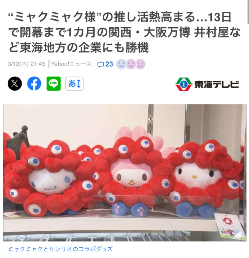 而且话又说回来,整个筹办大阪世博会的过程中,有一件事还是挺出乎我意料的,就是那些和世博会吉祥物“脉脉”联名的周边谷子,据说现在已经基本卖断货了,所以,到头来莫非这场荒诞的大阪世博会,真就还得靠日本的二次元们来拯救?