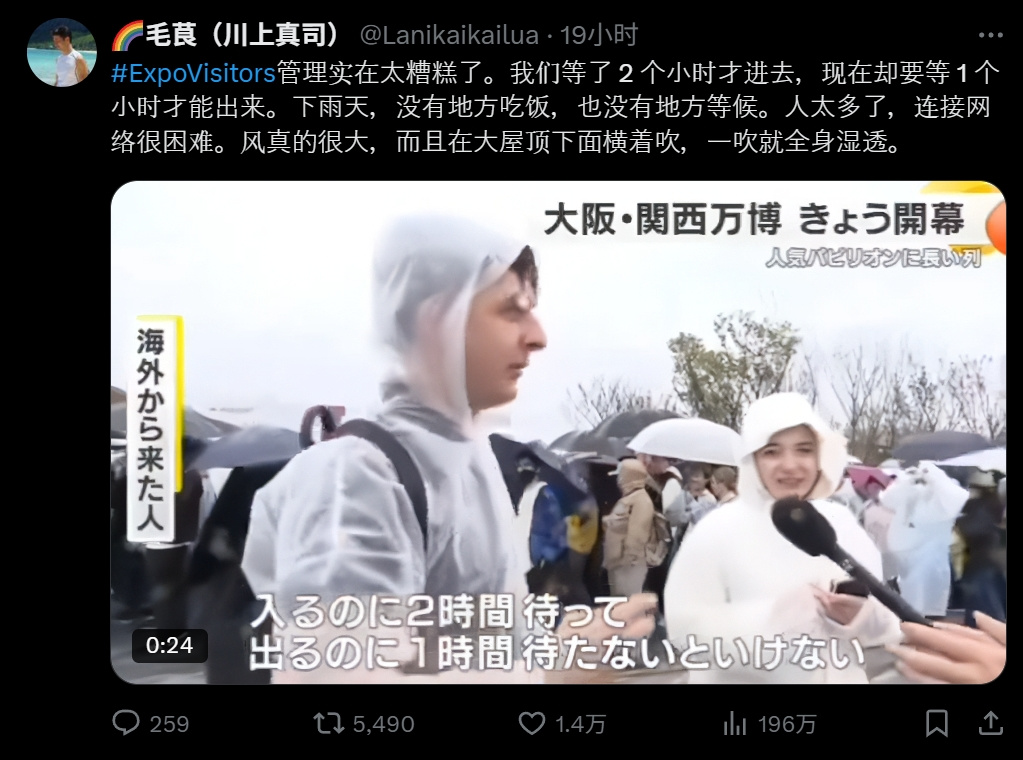 根据日本网友们在社交平台上发布的现场照片和视频来看,恶劣的天气和拥堵的排队环境,是第一天展览开幕后最受游客诟病的问题。从地铁出站口开始,大家就必须排起长队等待入场。最夸张的时候,不光进场排队要花两小时,退场也要再排一小时。加上当天正好遇到刮风下雨的恶劣天气,许多人不得不在排队时与风雨作伴。