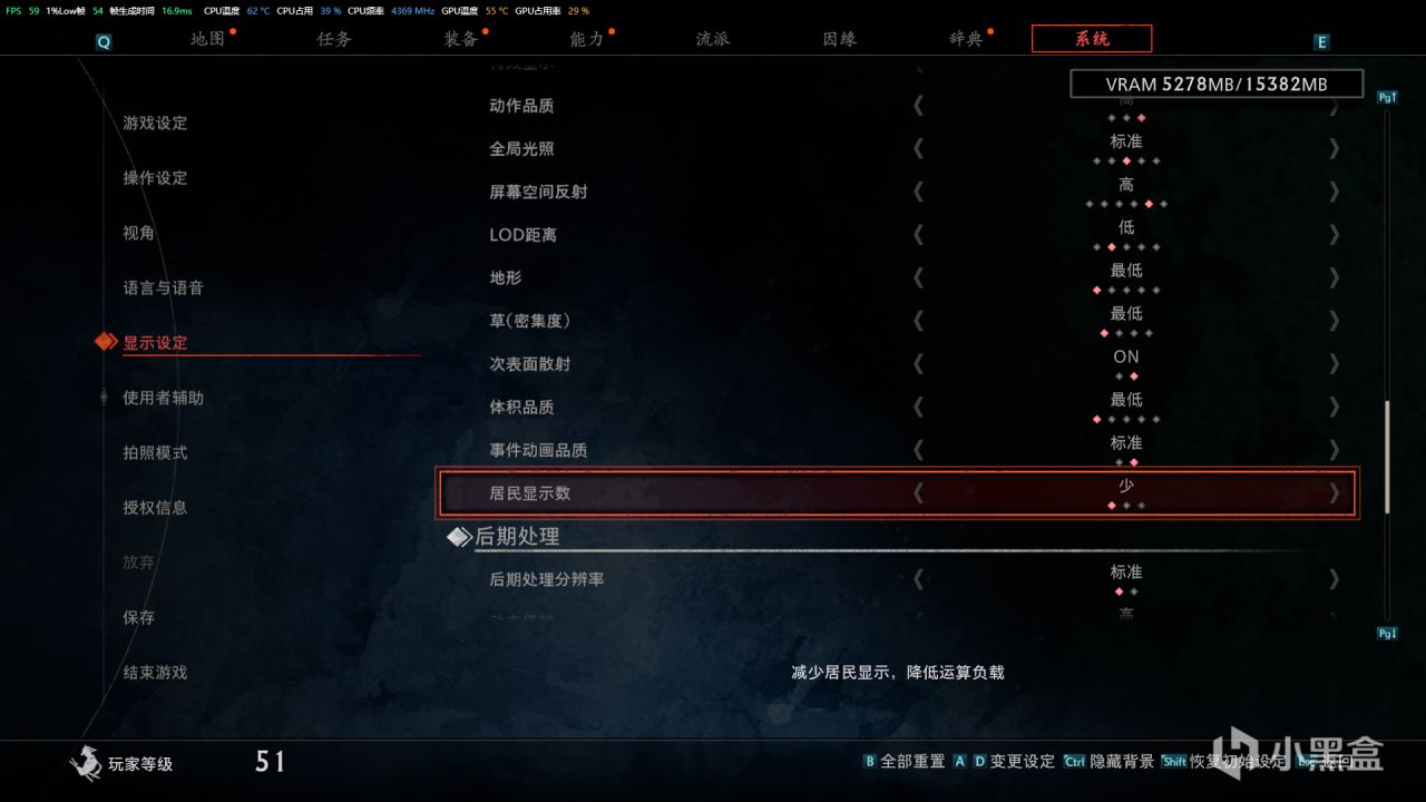 地形設置爲最低,草的密集度也設置爲最低。次表面反射:on,體力品質最低,事件品質動畫標準,居民顯示數最低。