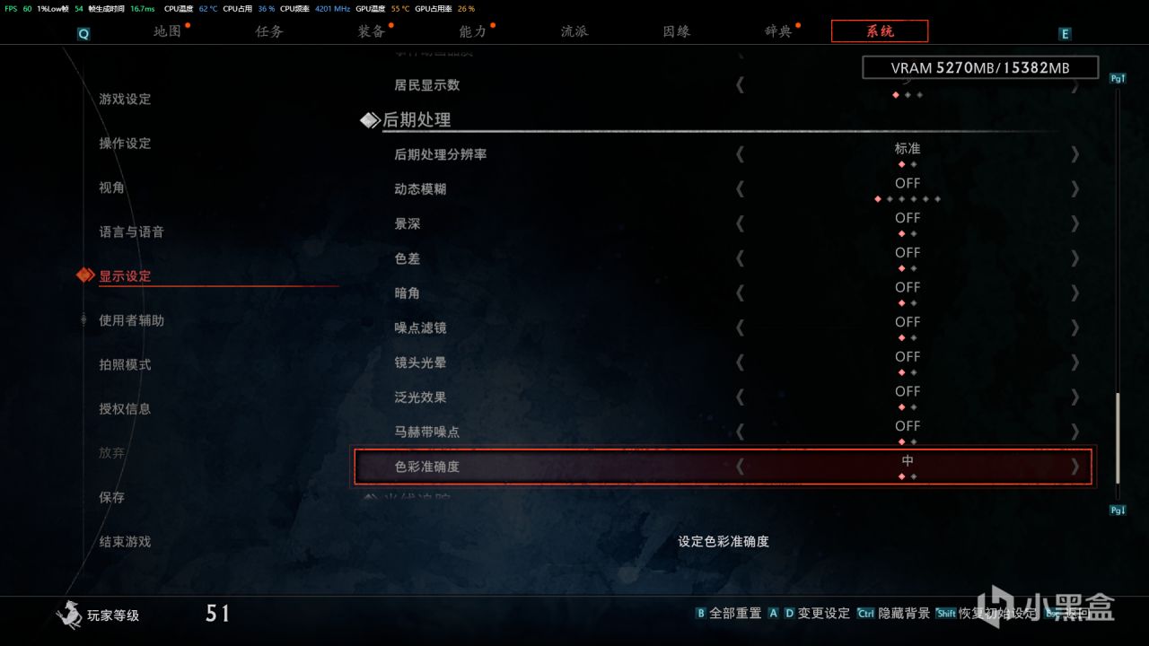 後期處理分辨率:標準。動態模糊:OFF。景深、色差、暗角、噪點濾鏡、鏡頭光暈、泛光效果、馬赫帶噪點全部關閉。色點準確度設置爲中,光線追蹤可以關閉!