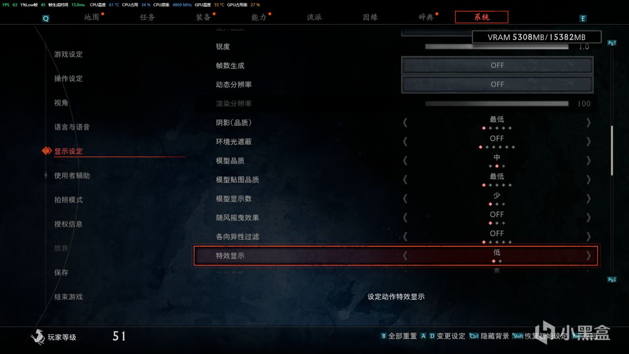 關閉各向異性,特效顯示設置爲低。動作品質設置爲中,全局光照設置爲最低。屏幕空間反射設置爲最低,LOD距離設置爲低。