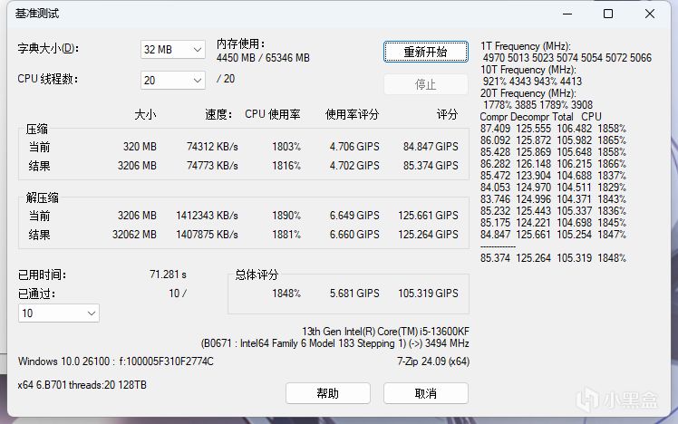 默频测试:压缩得分85GIPS,解压缩得分125GIPS,总得分105GIPS。
