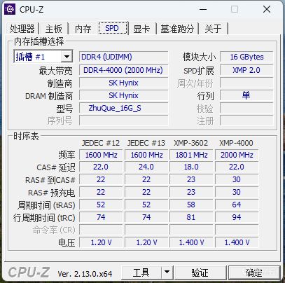 朱雀殊16G采用的是海力士 CJR-VKC颗粒,性能和稳定性不错。默频为3200Mhz C22-22-22-521.2v,XMP1为3600Mhz C18-23-23-58 1.4v,XMP2为4000Mhz C22-30-30-64 1.4v。