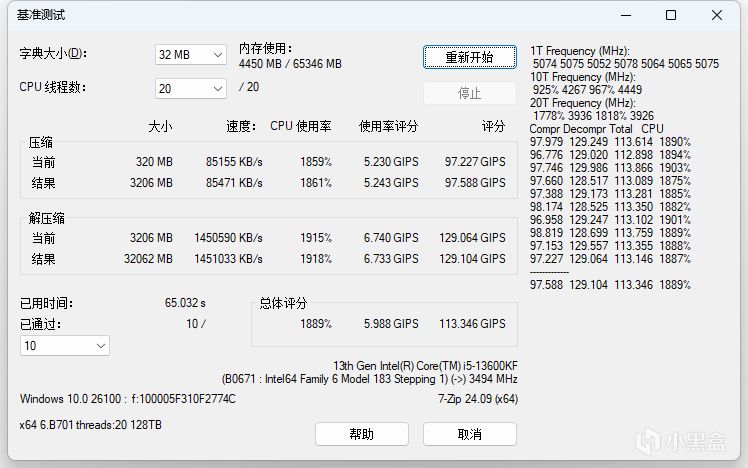 XMP超频后:压缩得分97GIPS,解压缩得分129GIPS,总得分113GIPS。